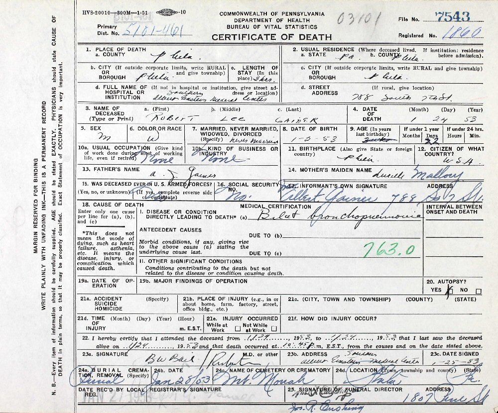 Died: January 24, 1953 in Philadelphia, Philadelphia County, Pennsylvania. (Death Certificate #7543.)