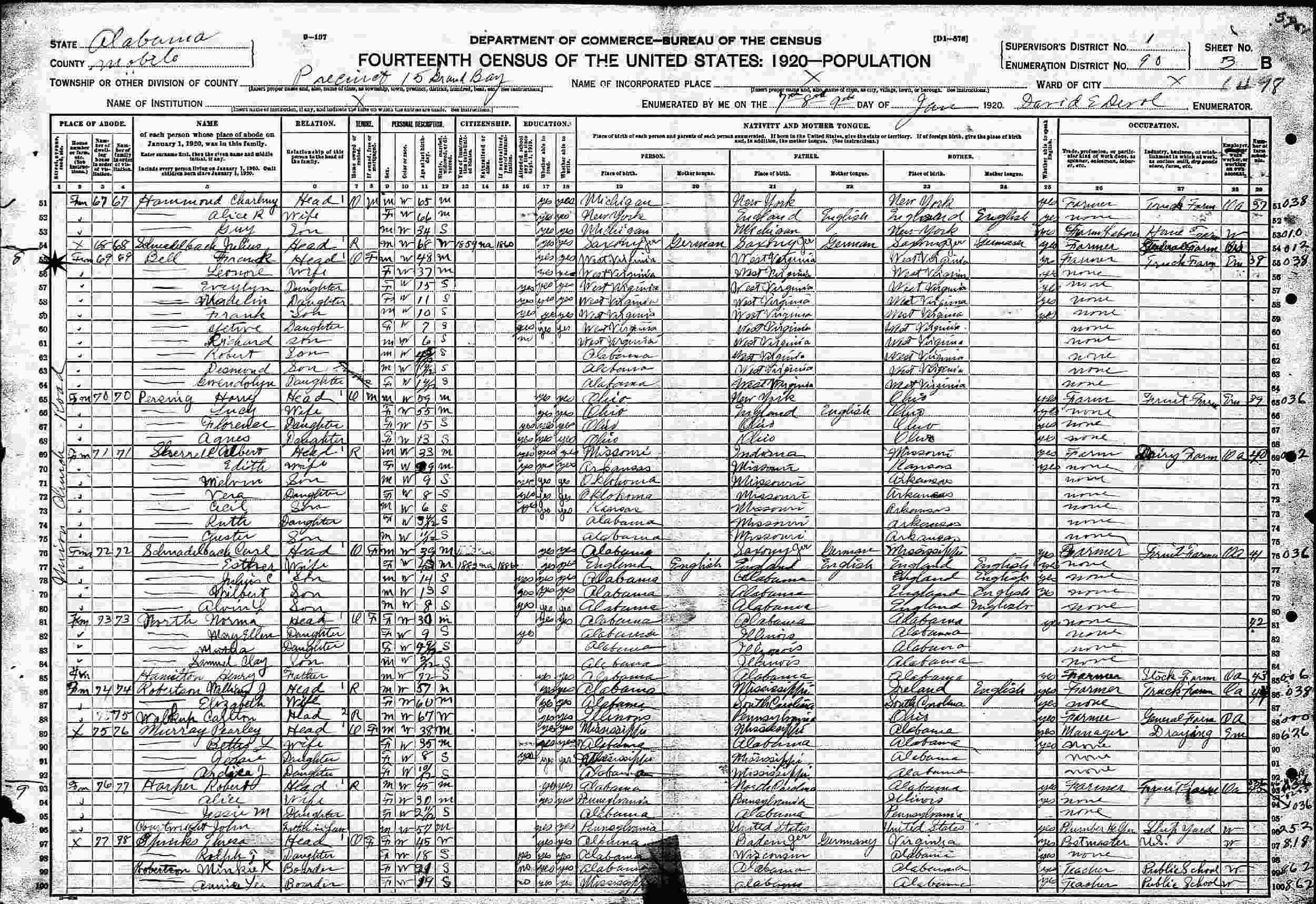 January 7-9, 1920 - Precinct 15, Supervisor's District 1, Enumeration District 90, Grand Bay, Mobile County, Alabama.
