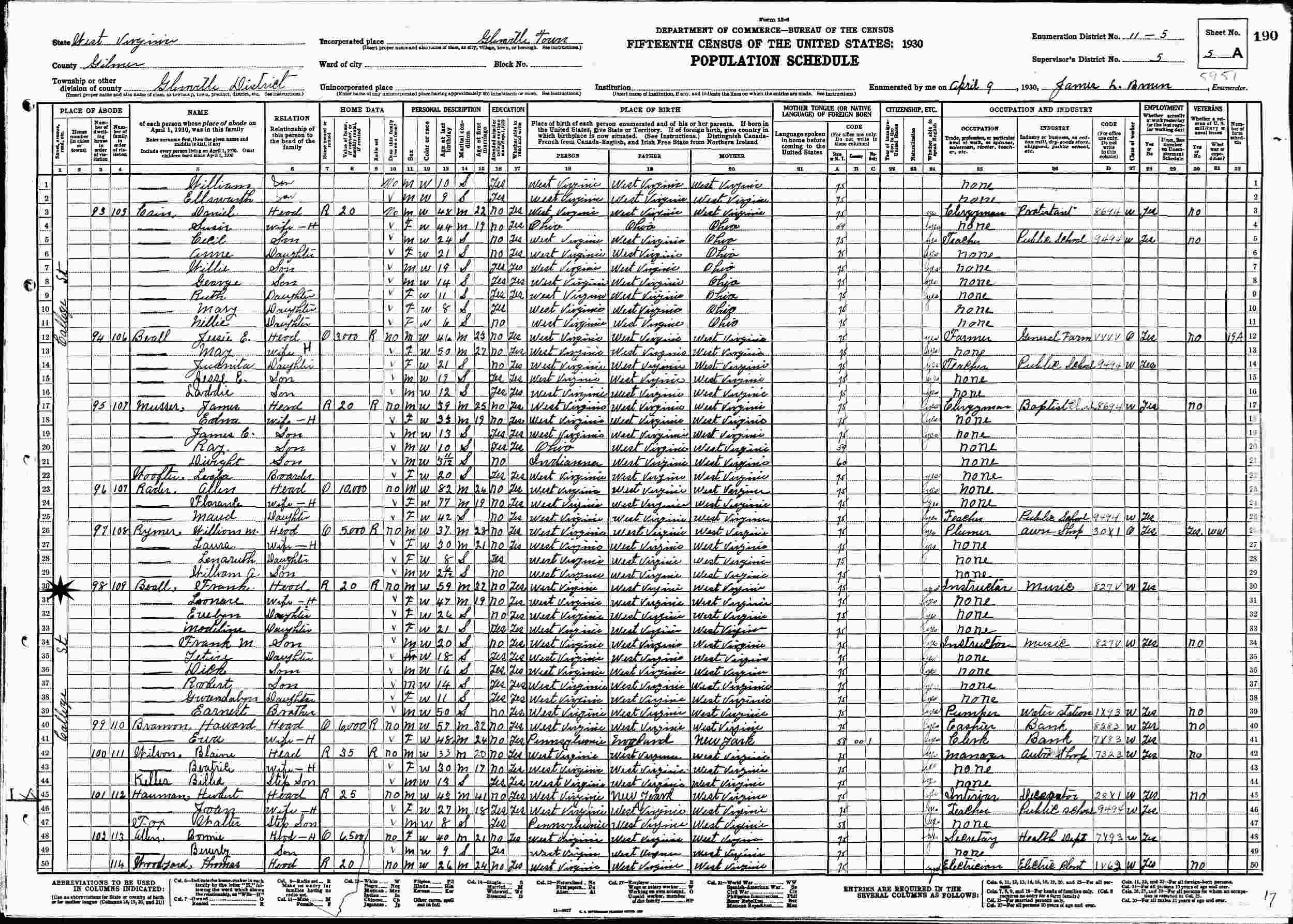 April 9, 1930 - Callege Street, Supervisor's District 5, Enumeration District 11-5, Glenville, Gilmer County, West Virginia.