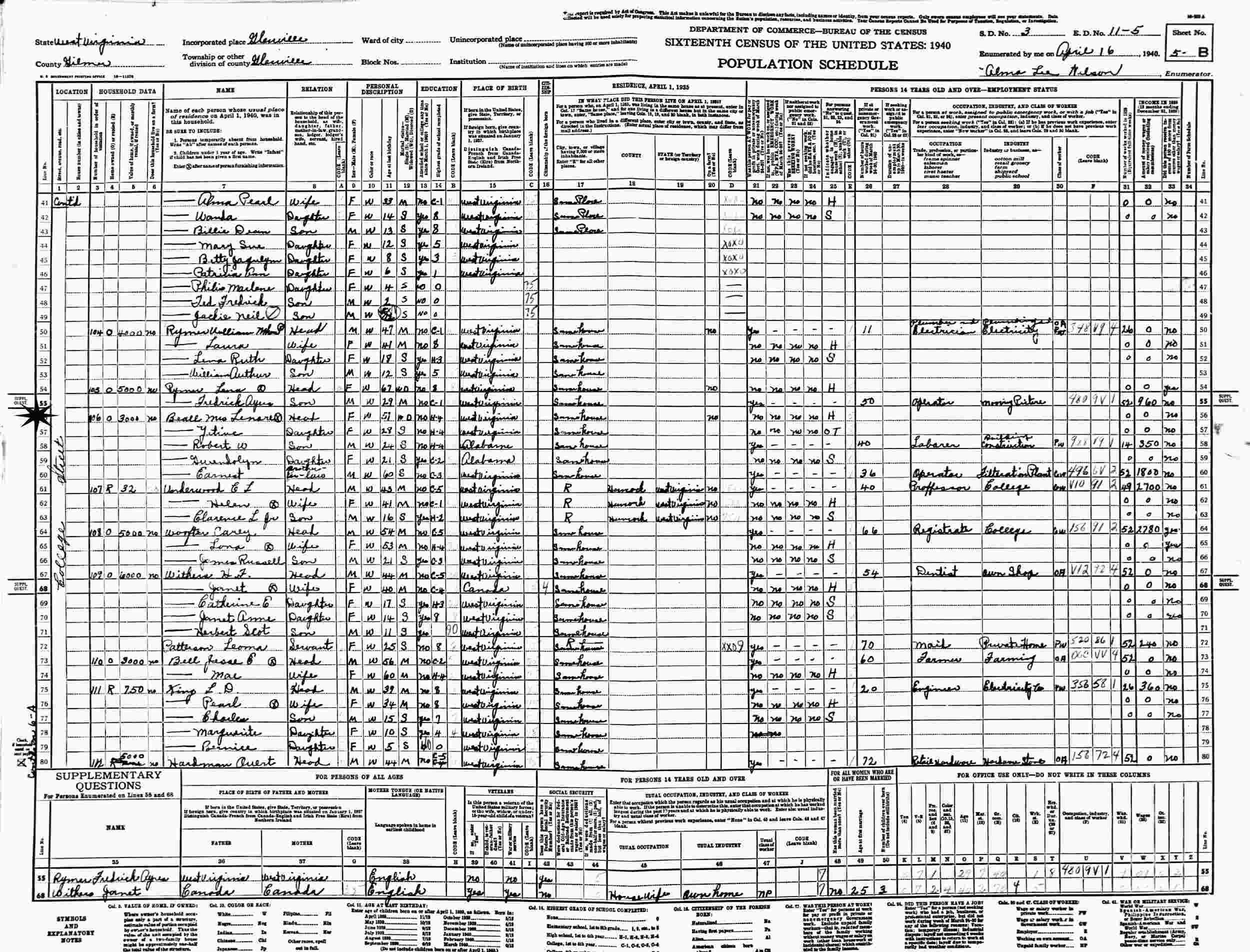 April 16, 1940 - Callege Street, Supervisor's District 3, Enumeration District 11-5, Glenville, Gilmer County, West Virginia.