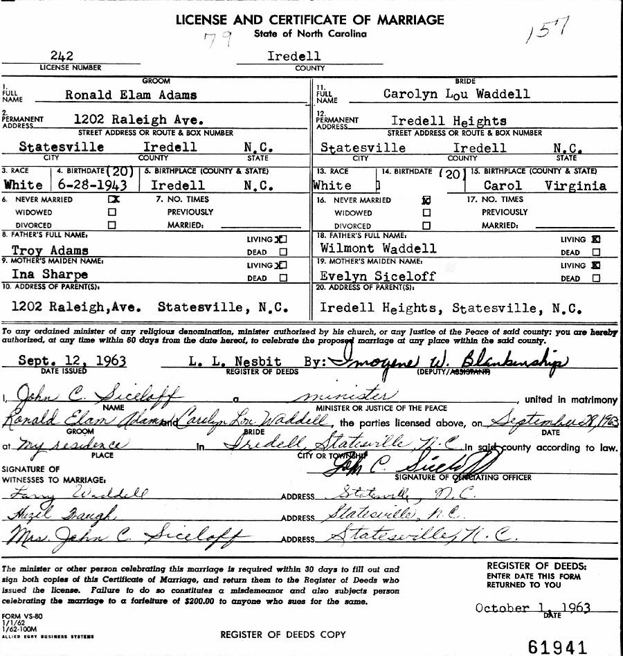 Married: Carolyn Lou Waddell September 28, 1963 in Iredell County, North Carolina.