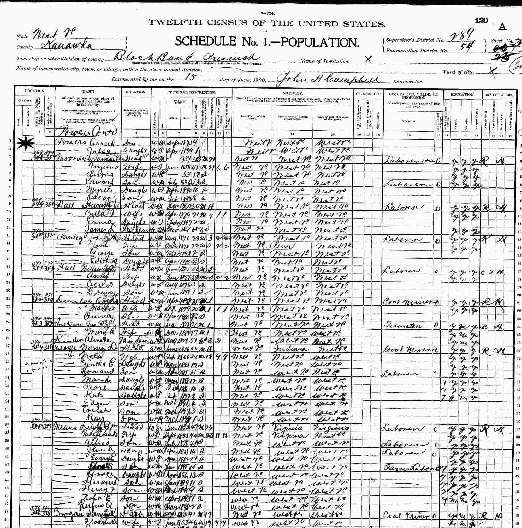 June 15, 1900 - Black Band, Precinct 3, Supervisor's District 289, Enumeration District 34, Kanawha County, West Virginia.