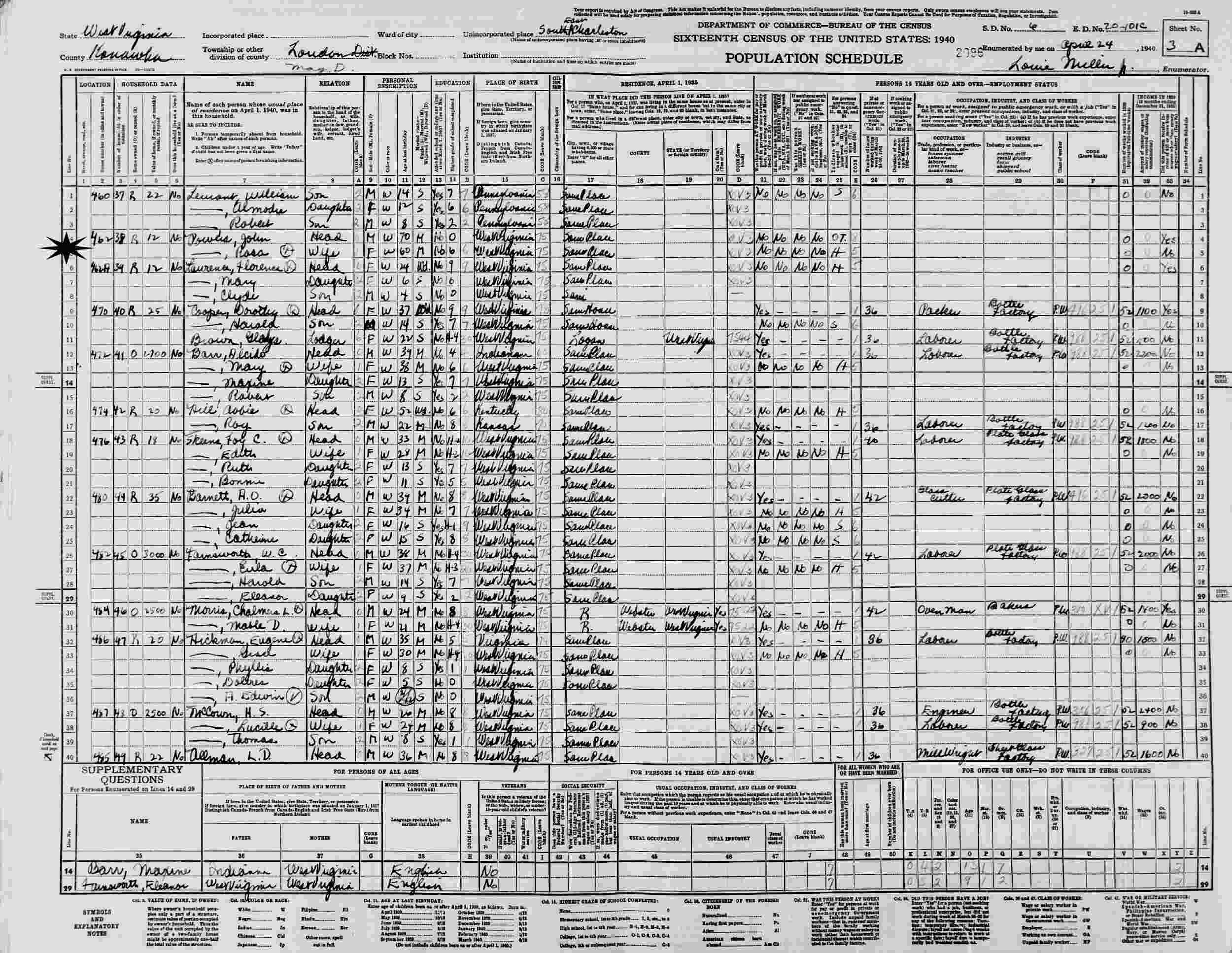 April 24, 1940 - Supervisor's District 6, Enumeration District 20-101C, Loundon Magisterial District, Southeast Charleston, Kanawha County, West Virginia.