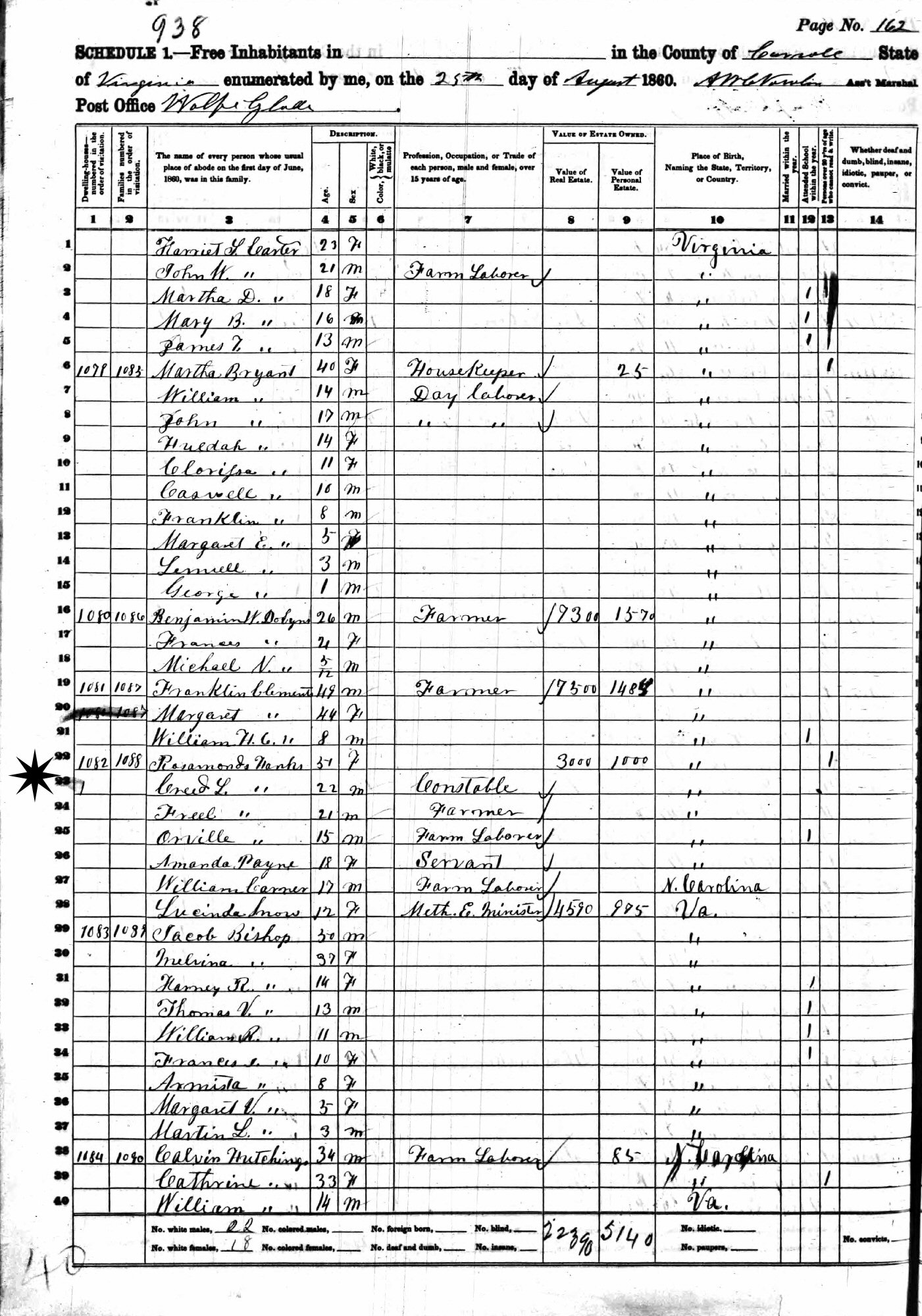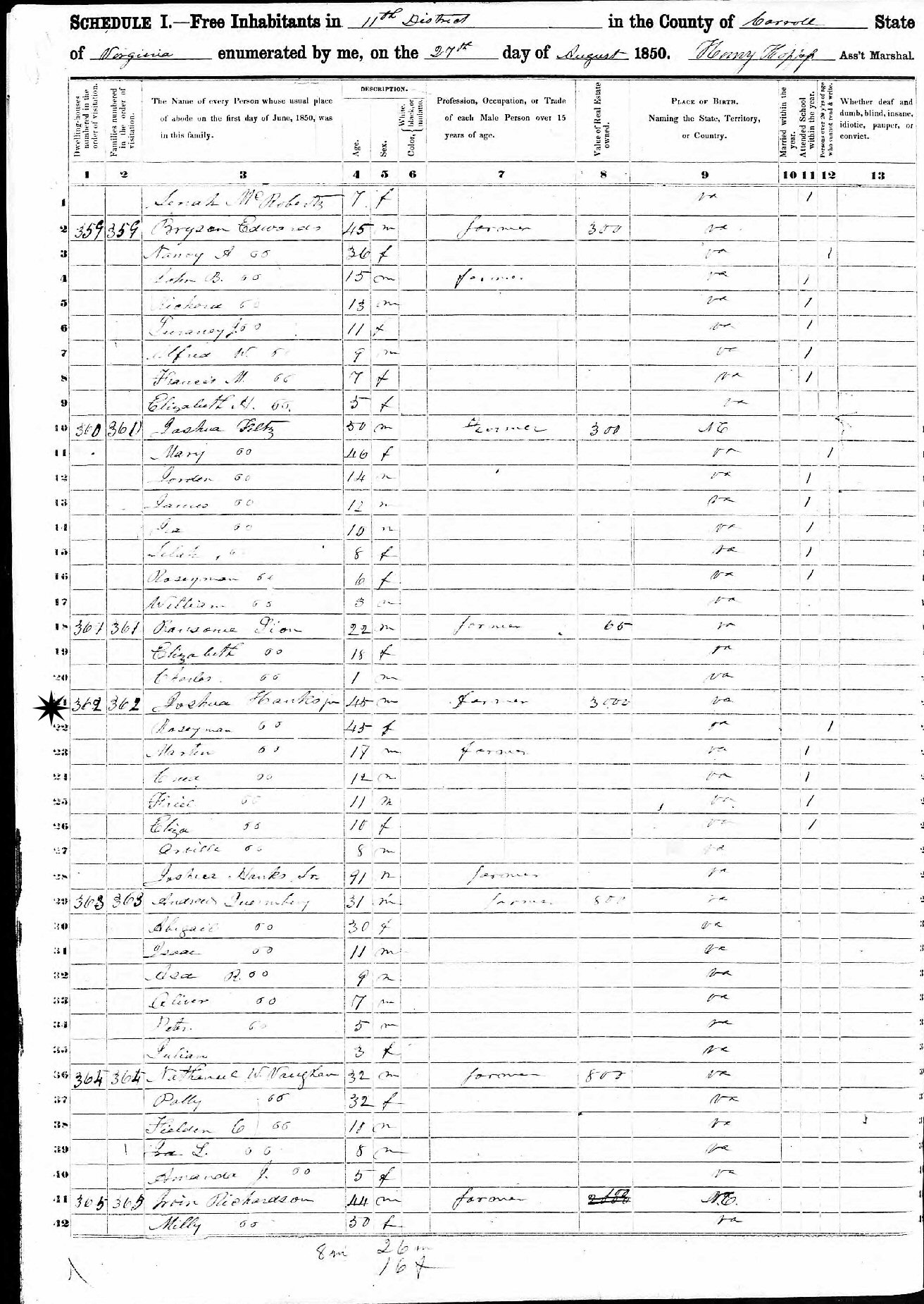 August 25, 1850 - 11th District, Carroll County, Virginia.