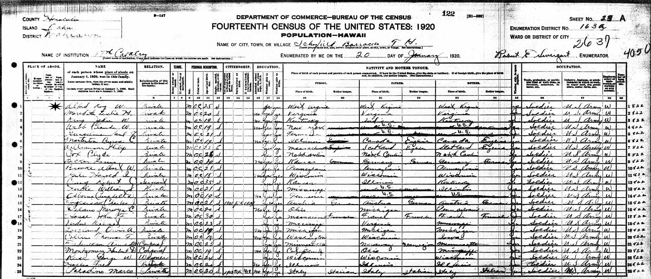 January 20, 1920 - 11th Cavalry, Schofield Barracks, Enumeration District 163a, Wahiawa, Honolulu, Oahu, Hawaii Territory.