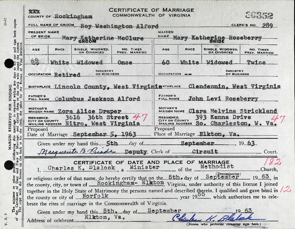 (2) Mary Katherine Roseberry September 5, 1963 n Elkton, Rockingham County, Virginia. (Daughter of John Levi and Clara Melvina (Strickland) Roseberry. She was born about 1903, Clendennin, Kanawha County, West Virginia and died August 30, 1971, Roane, West Virginia.)