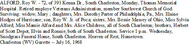 Died: June 15, 1968 in Charleston, Kanawha County, West Virginia.