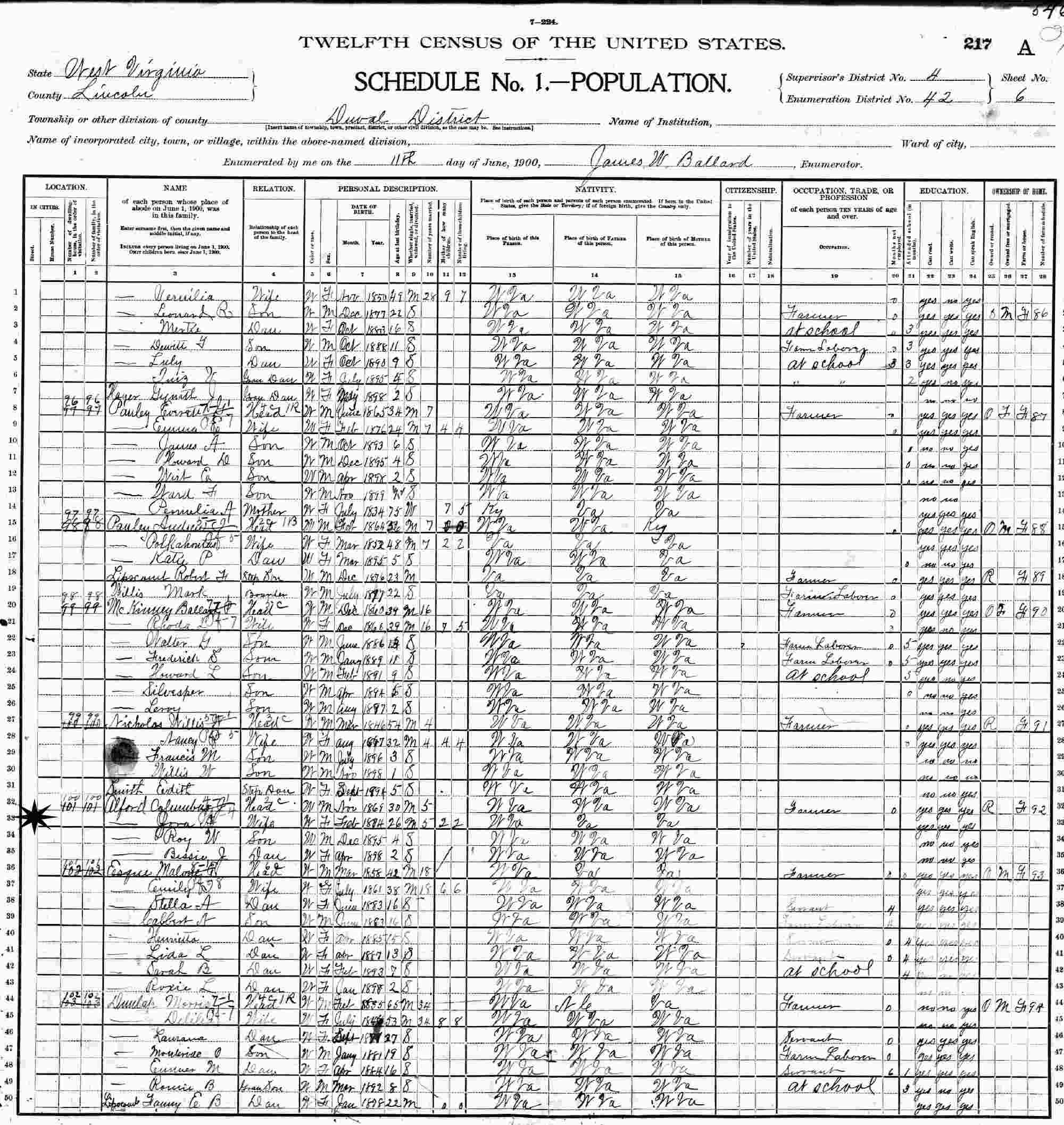 June 11, 1900 - Supervisor's District 4, Enumeration District 42, Duval District, Lincoln County, West Virginia.