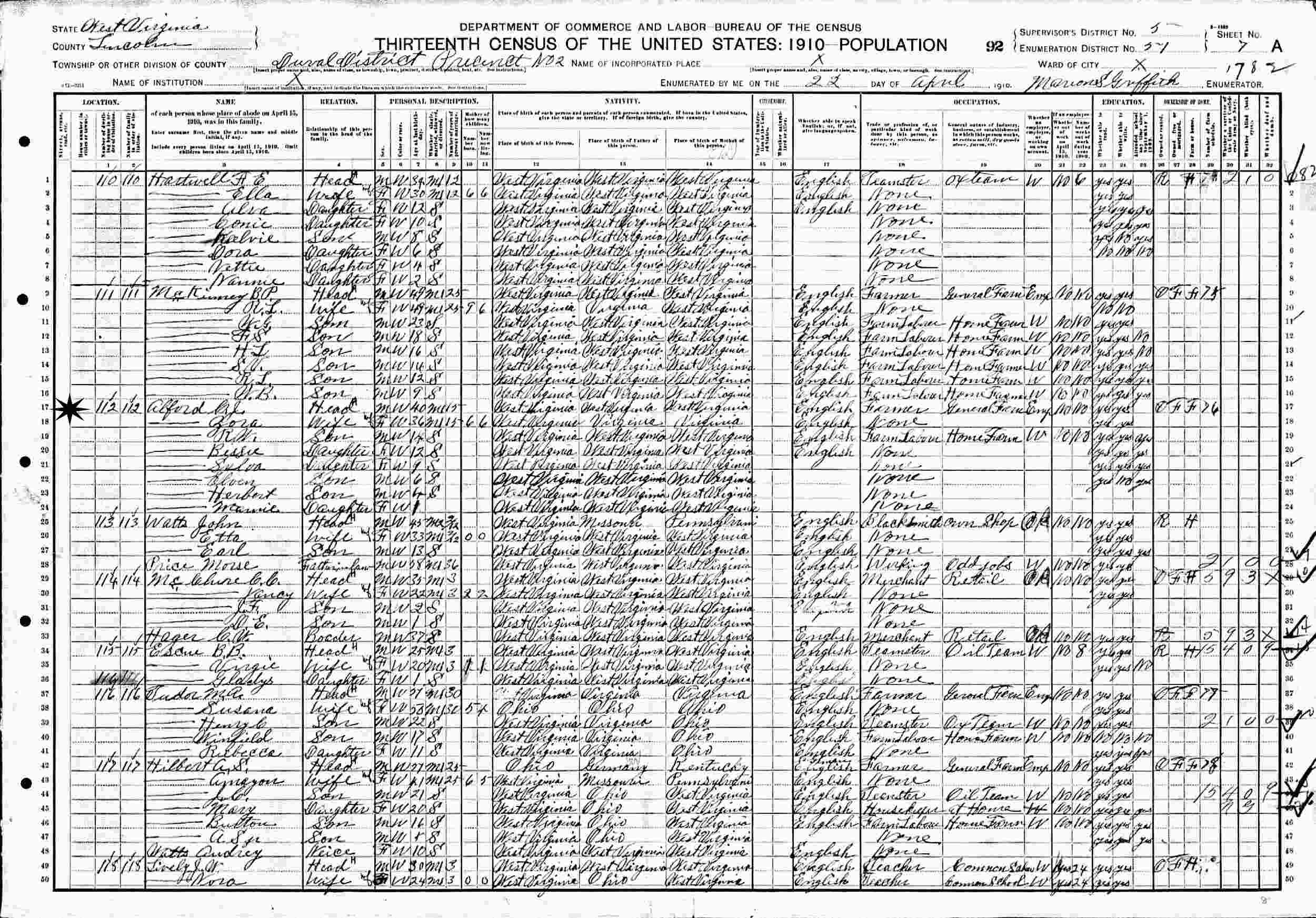 April 22, 1910 - Duval District, Precinct 2, Supervisor's District 5, Enumeration District 51, Lincoln County, West Virginia.