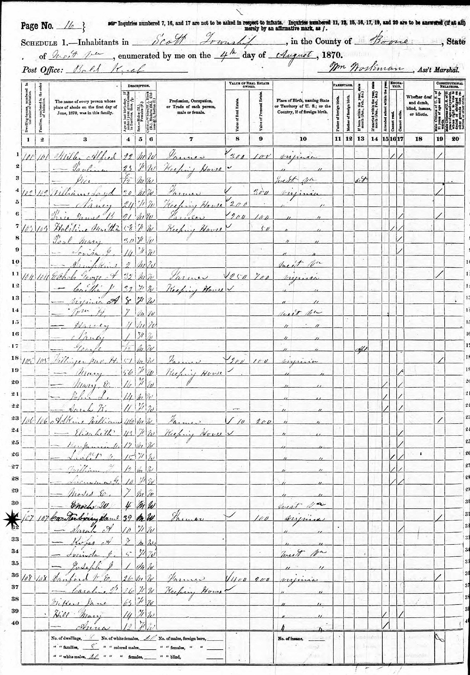 August 4, 1870 - Scott Township, Bald Knob Post Office, Boone County, West Virginia.