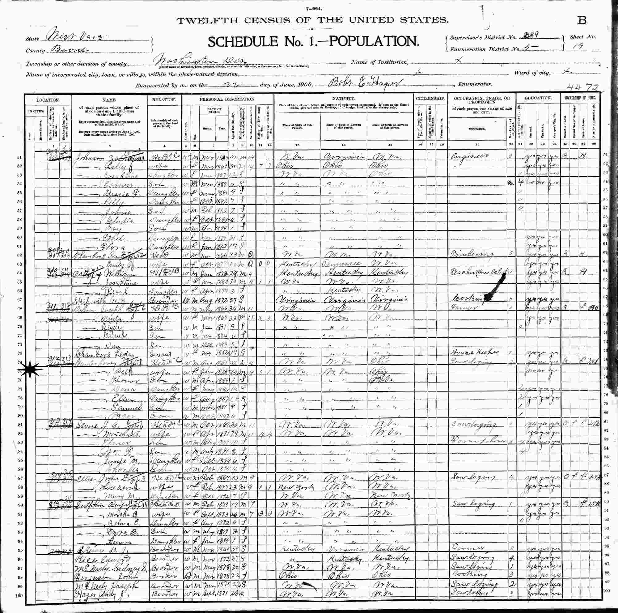 June 22, 1900 - Supervisor's District 289, Enumeration District 5, Washington District, Boone County, West Virginia.