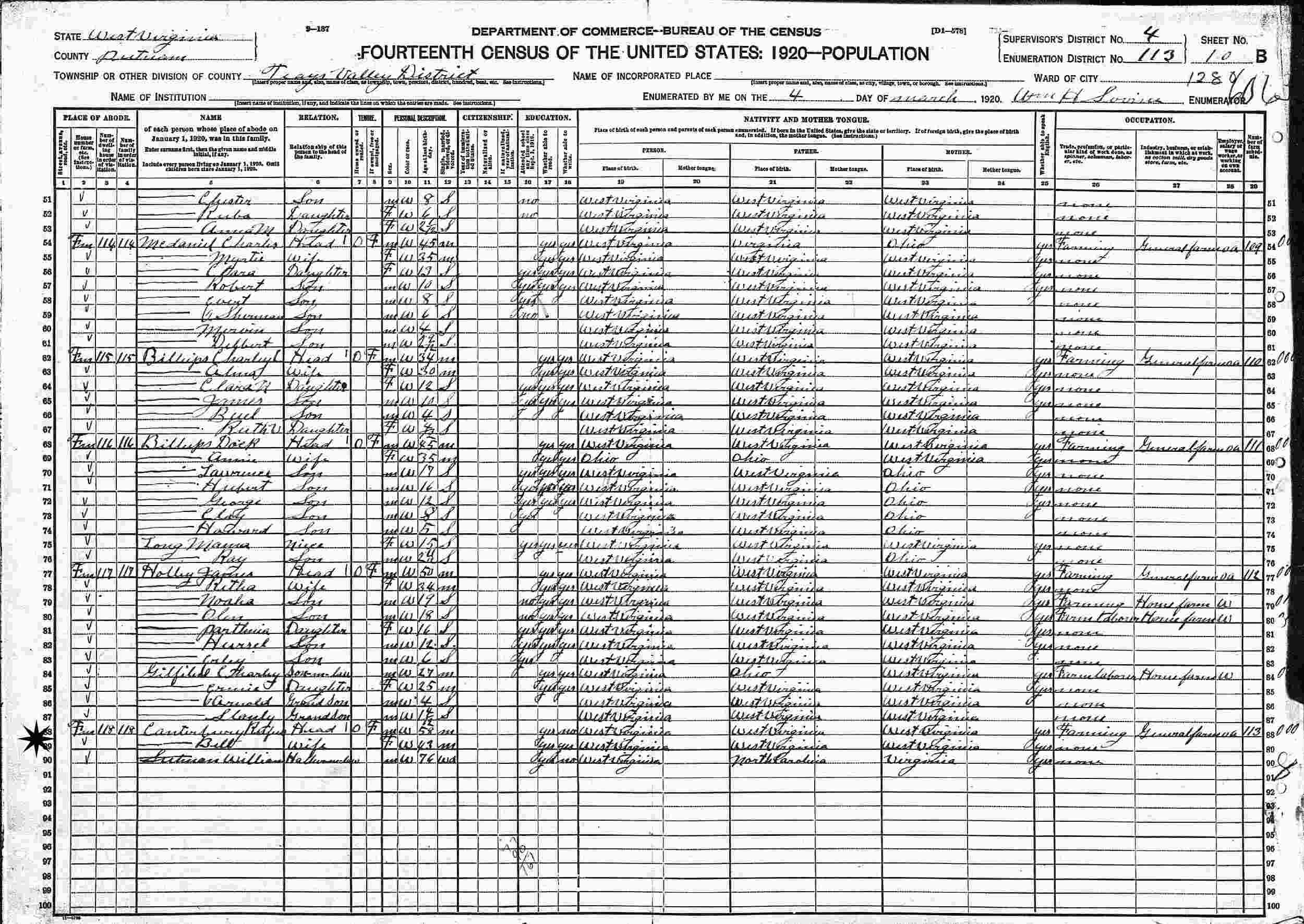 April 3, 1920 - Supervisor's District 4, Enumeration District 113, Teays Valley District, Putnam County, West Virginia.