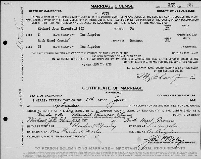 Married: Michael John Ehrenfeld, III June 26, 1930 in Los Angeles, Los Angeles County, California.