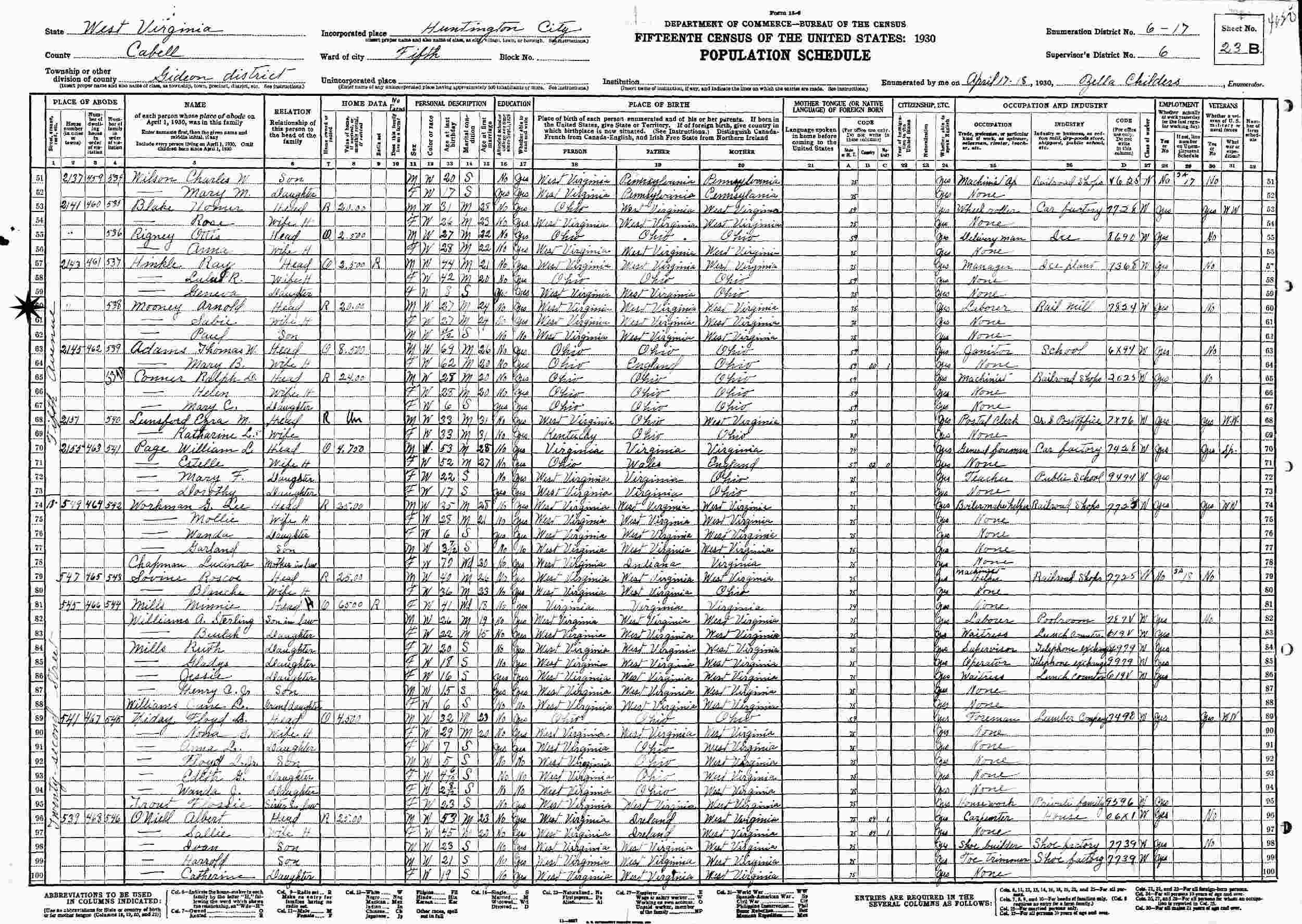April 17-18, 1930 - 2143 Fifth Avenue, Fifth Ward, Supervisor's District 6, Enumeration District 6-17, Gideon District, Huntington, Cabell County, West Virginia.
