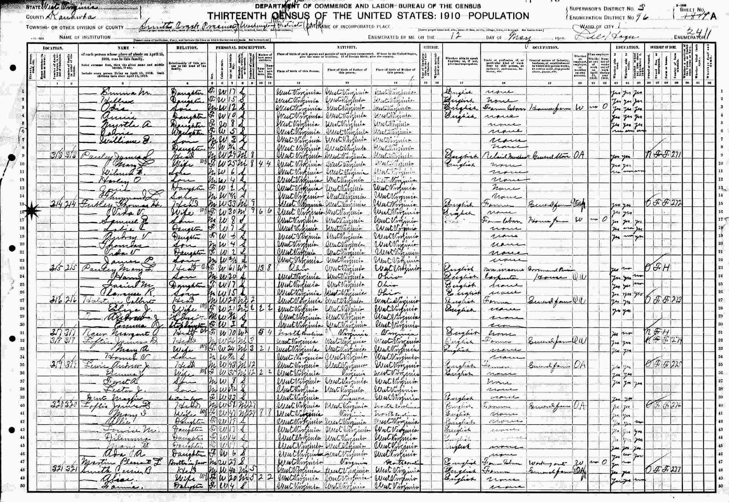 May 12, 1910 - Ward 1, Supervisor's District 3, Enumeration District 96, Smith Creek Precinct, Washington Magisterial District, Kanawha County, West Virginia.