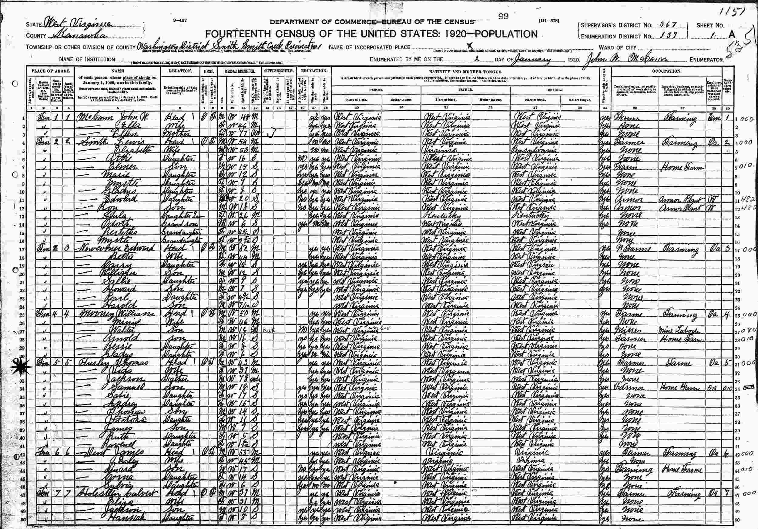 January 02, 1920 - Supervisor's District 367, Enumeration District 137, Smith Creek Precinct, Washington District, Kanawha County, West Virginia.