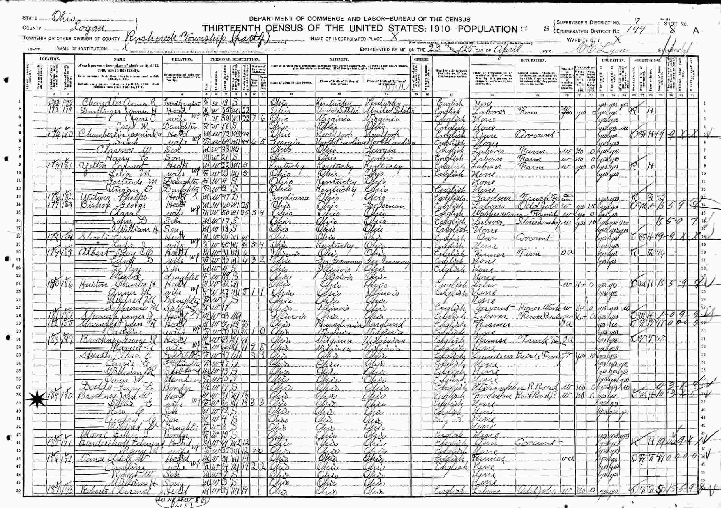April 23-25, 1910 - Supervisor's District 7, Enumeration District 144, Rush Creek Township, Logan County, Ohio.