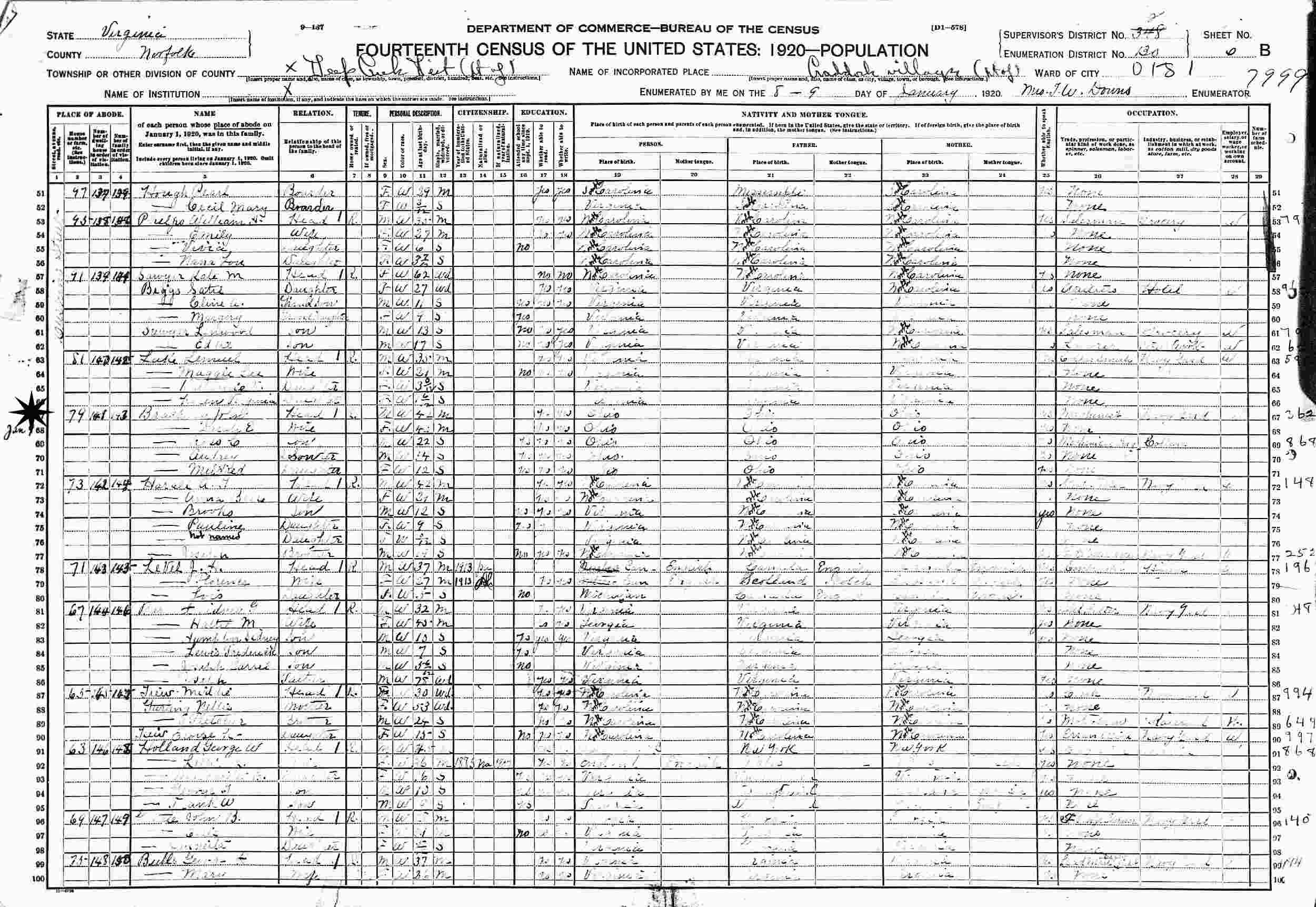 January 8-9, 1920 - Supervisor's District 348 (crossed out to 2), Enumeration District 130, Deep Creek District, Craddock Village, Norfolk County, Virginia.