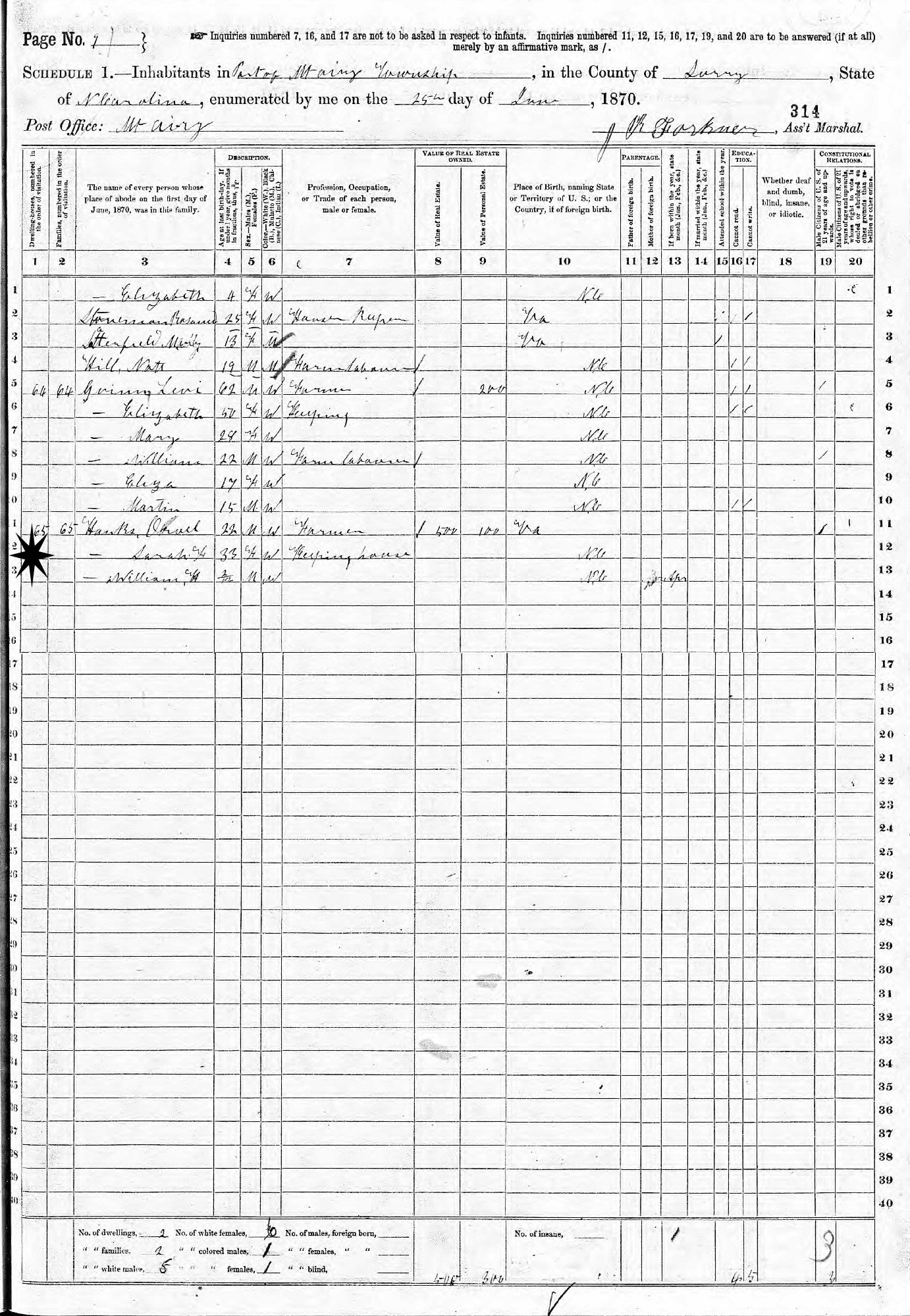 June 25, 1870 - Mt. Airy, Surry County, North Carolina.