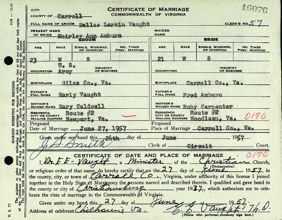 Married: Dallas Larkin Vaught June 27, 1957 in Carroll County, Virginia.