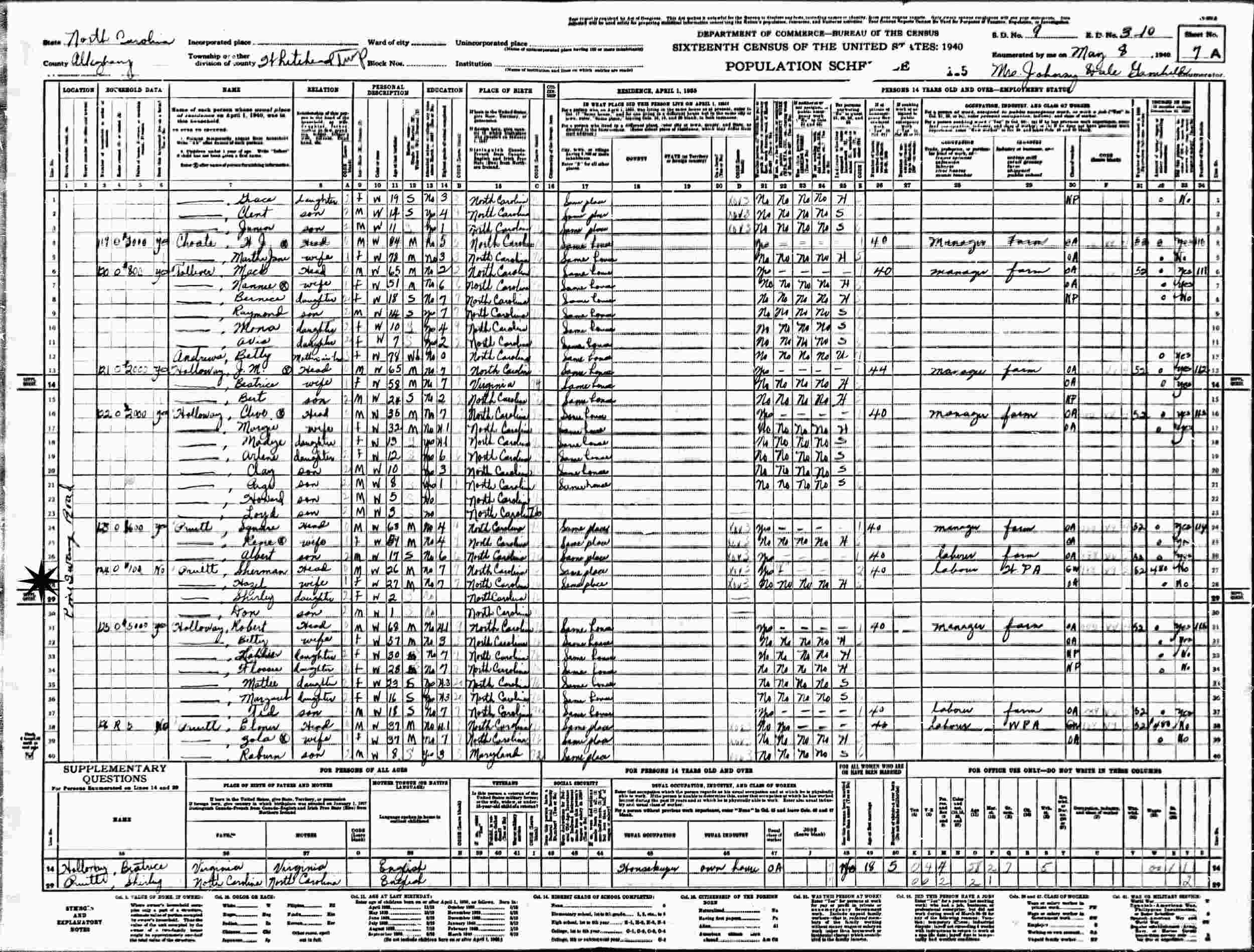 May 8, 1940 - Pine Swany Road, Supervisor's District 9, Enumeration District 3-10, Whitehead, Alleghany County, North Carolina.
