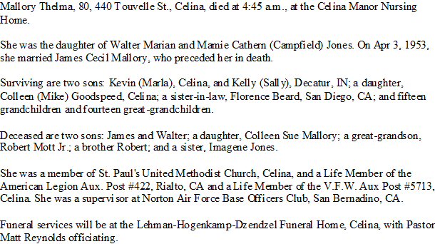 Notes for THELMA KATHERINE JONES MALLORY: