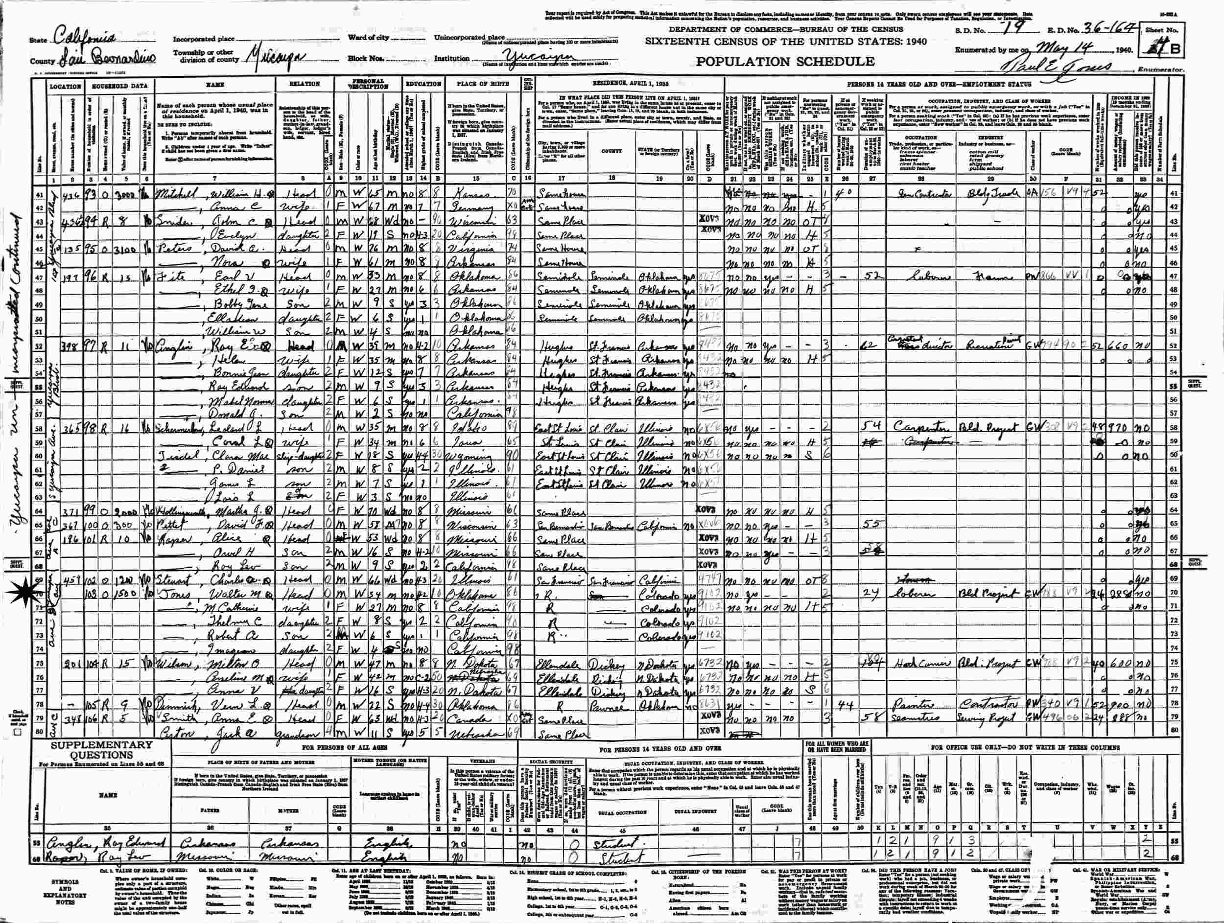 May 14, 1940 - 459 Avenue B, Supervisor's District 19, Enumeration District 36-164, Yucaipa, San Bernardino County, California.