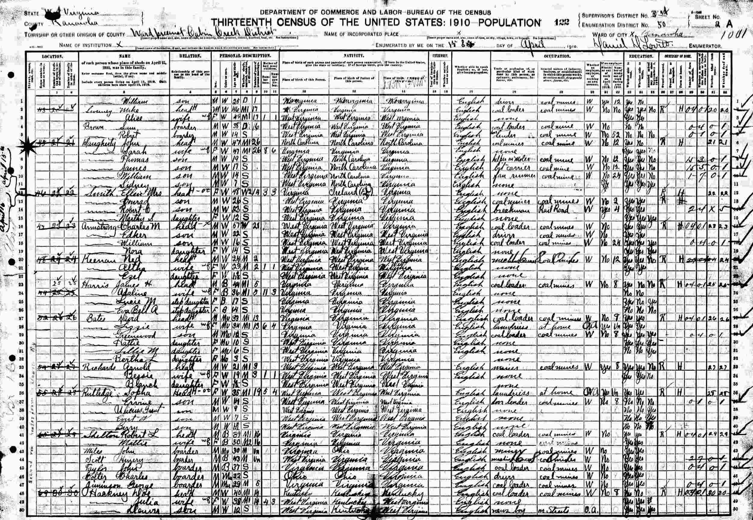 April 8, 1910 - Supervisor's District 3, Enumeration Districtt 50, Ward Precinct, Cabin Creek District, Kanawha County, West Virginia.
