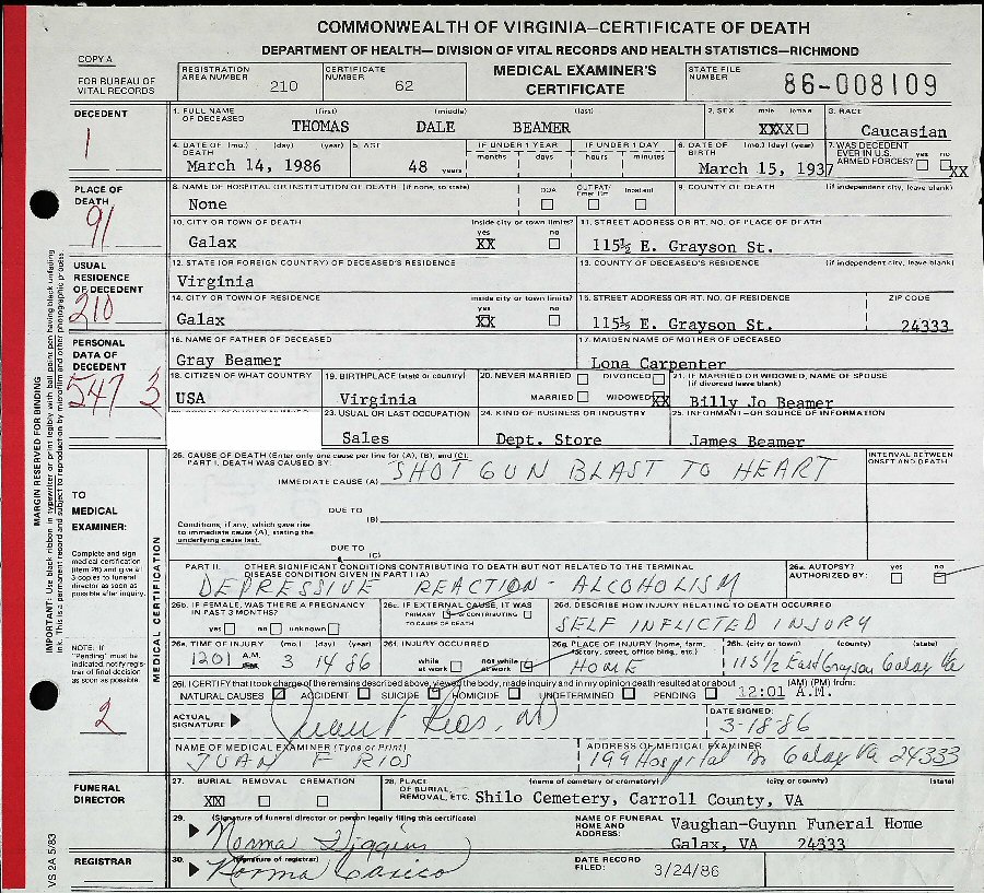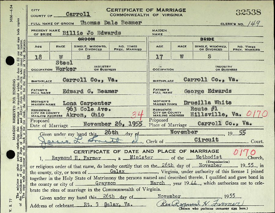 Married: Billie Jo Edwards November 26, 1955 in Galax, Virginia.