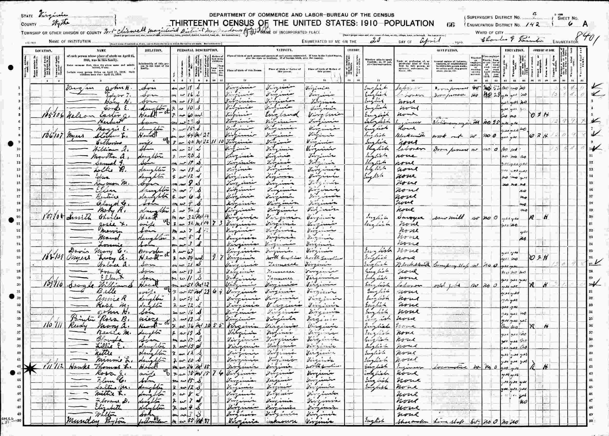 April 20, 1910 - Supervisor's District 9, Enumeration District 142, Max Meadows, Fort Chiswell Magisterial District, Wythe County, Virginia.