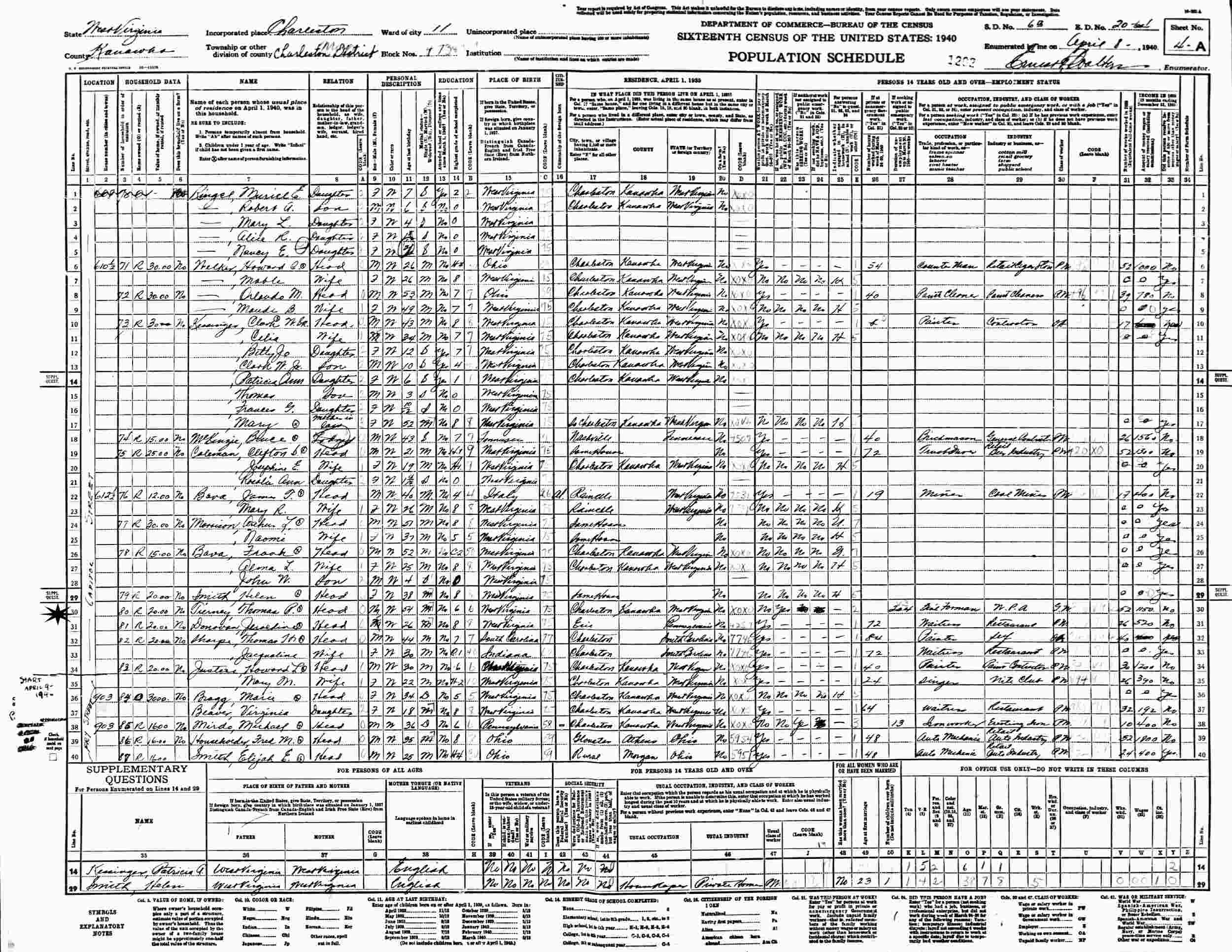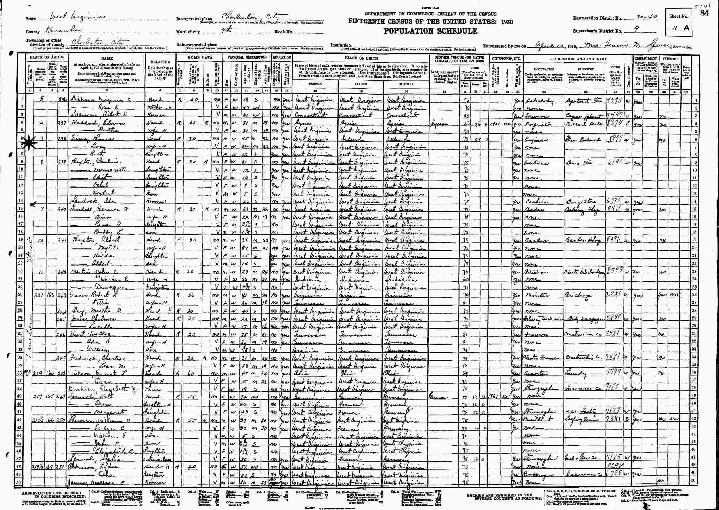 April 10, 1930 - 7 Truslow Street, Ward 9, Supervisor's District 9, Enumeration District 20-40, Charleston, Kanawha County, West Virginia.
