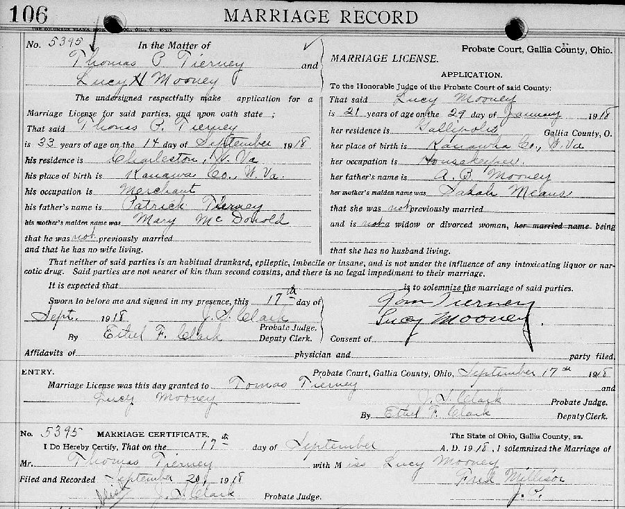 Married: Lucy Hazelton Mooney September 17, 1918 in Gallia County, Ohio.