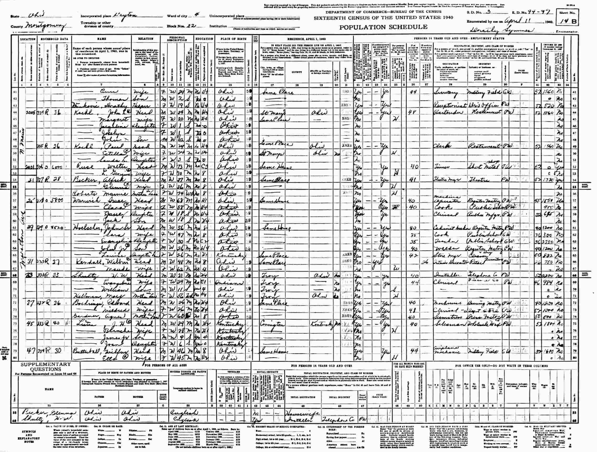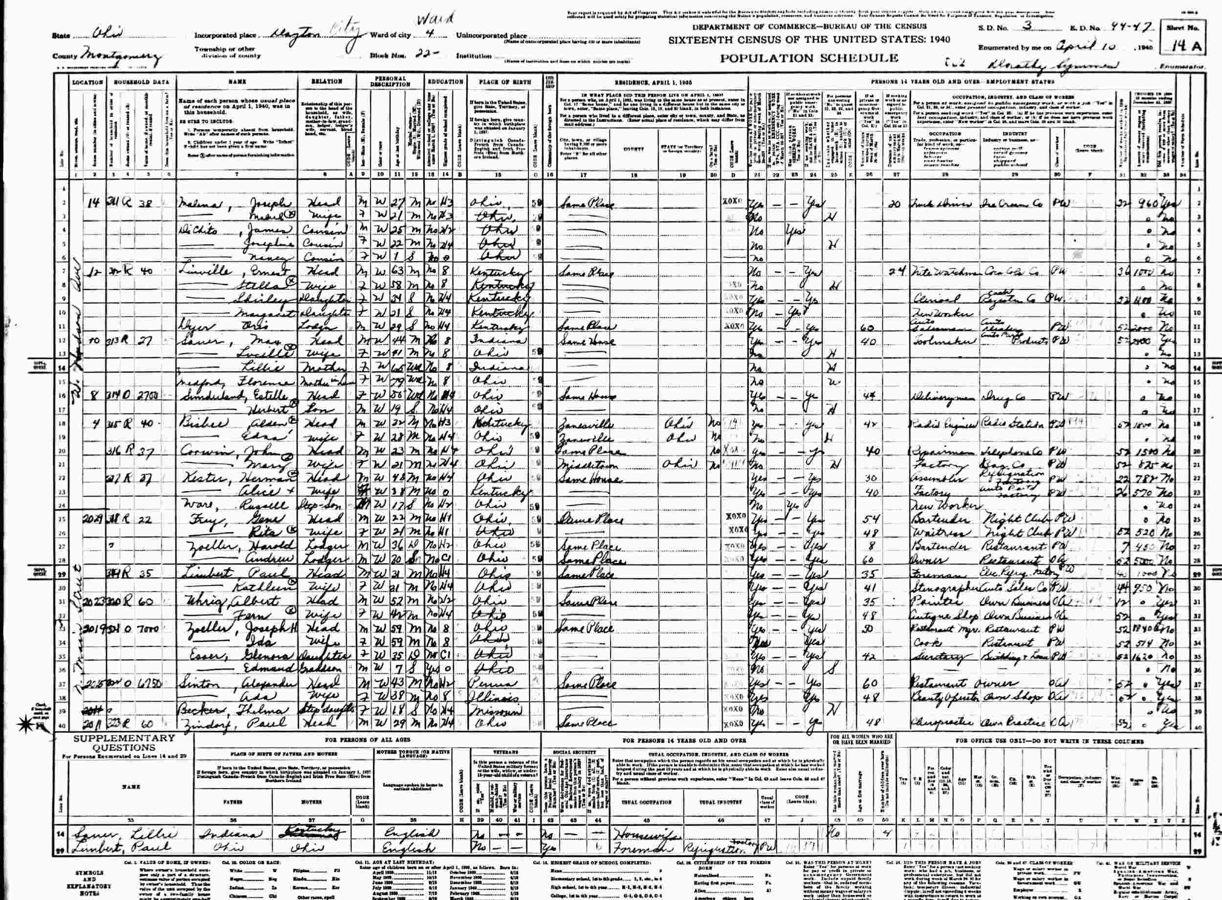 April 10, 1940 - 2011 North Main Street, Ward 4, Block 22, Supervisor's District 3, Enumeration District 44-47, Dayton, Montgomery County, Ohio.