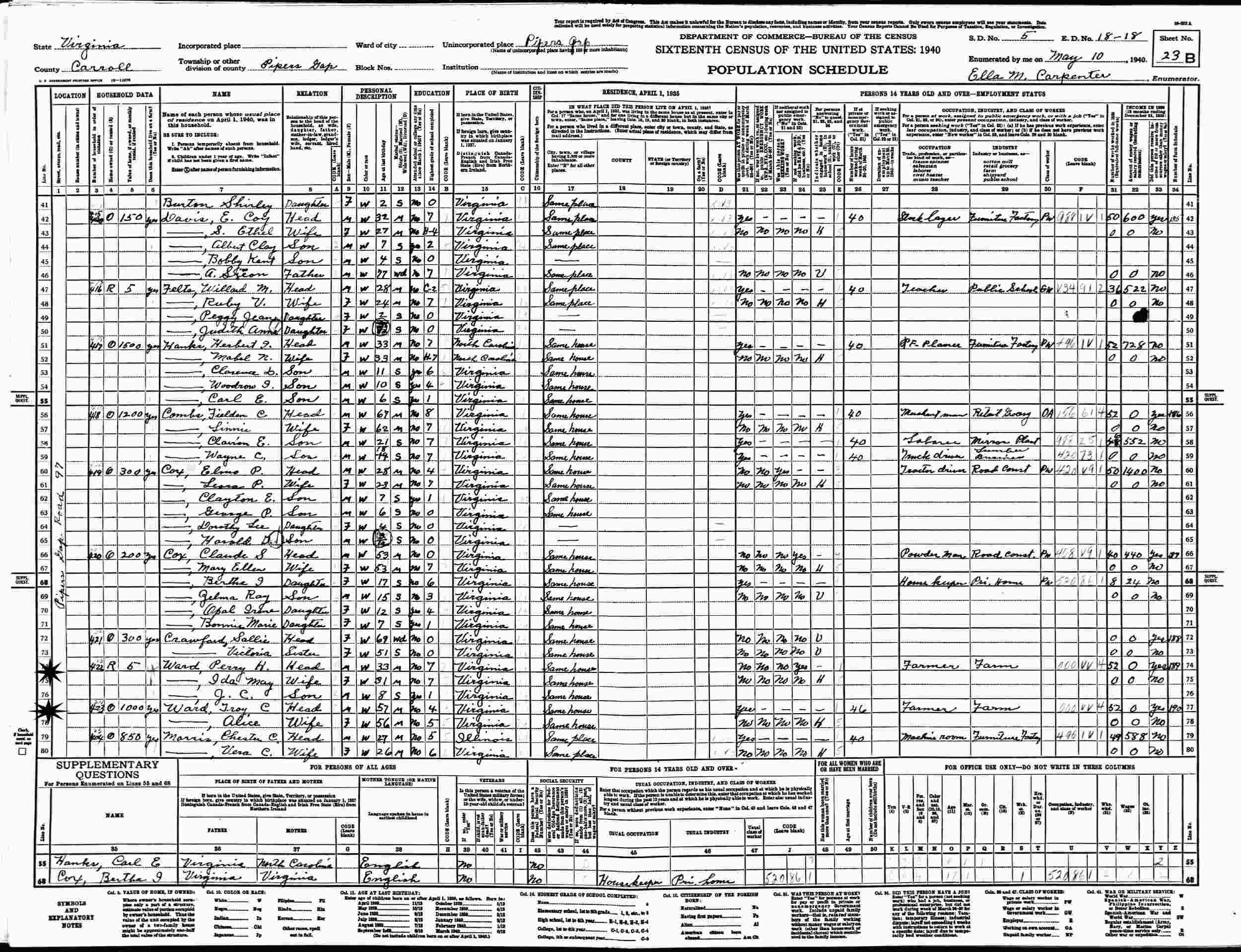 May 10, 1940 - Supervisor's District 5, Enumeration District 18-18, Pipers Gap, Carroll County, Virginia.
