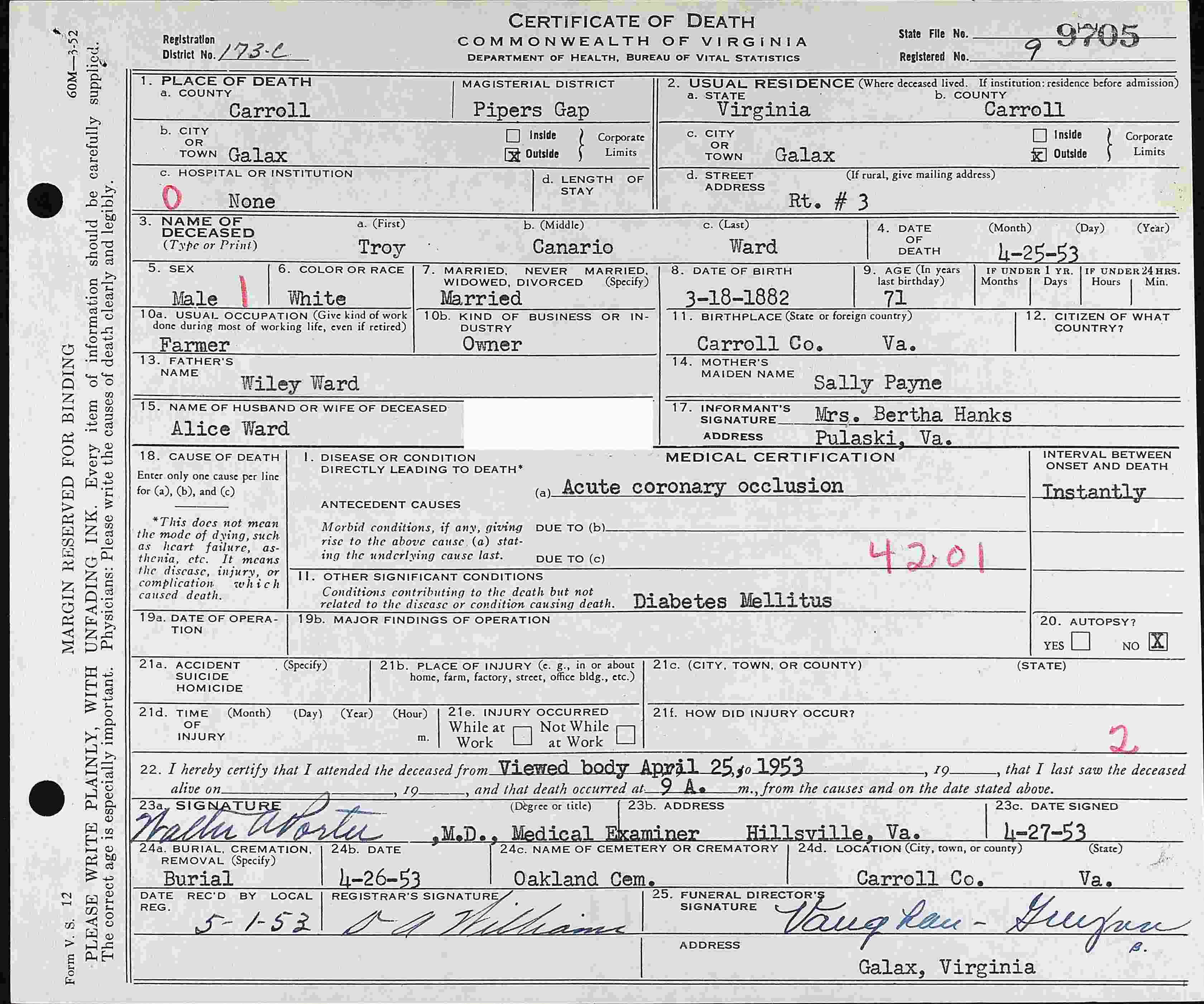Died: April 25, 1953 in Galax, Carroll County, Virginia.