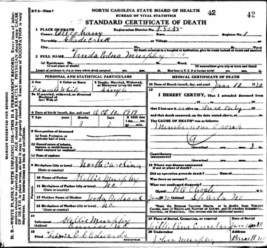 Died: January 12, 1920 in Glade Creek, Alleghany County, North Carolina.