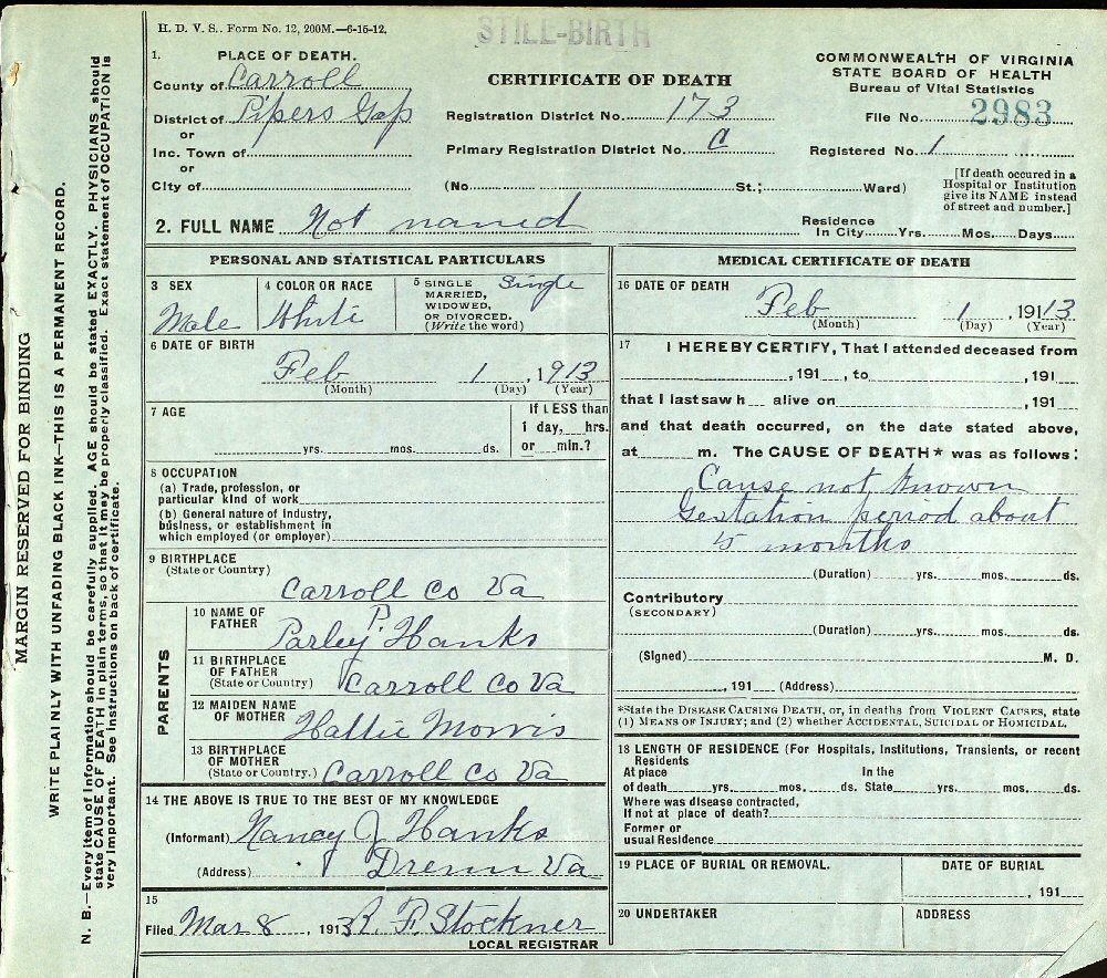 Notes for UNNAMED SON HANKS: Son of Parley Franklin and Hattie L (Morris) Hanks, Sr. Born: February 1, 1913 in Pipers Gap, Carroll County, Virginia. Died: February 1, 1913 in Pipers Gap, Carroll County, Virginia.