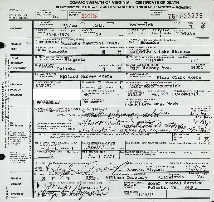 Died: November 8, 1976 in Roanoke, Virginia.