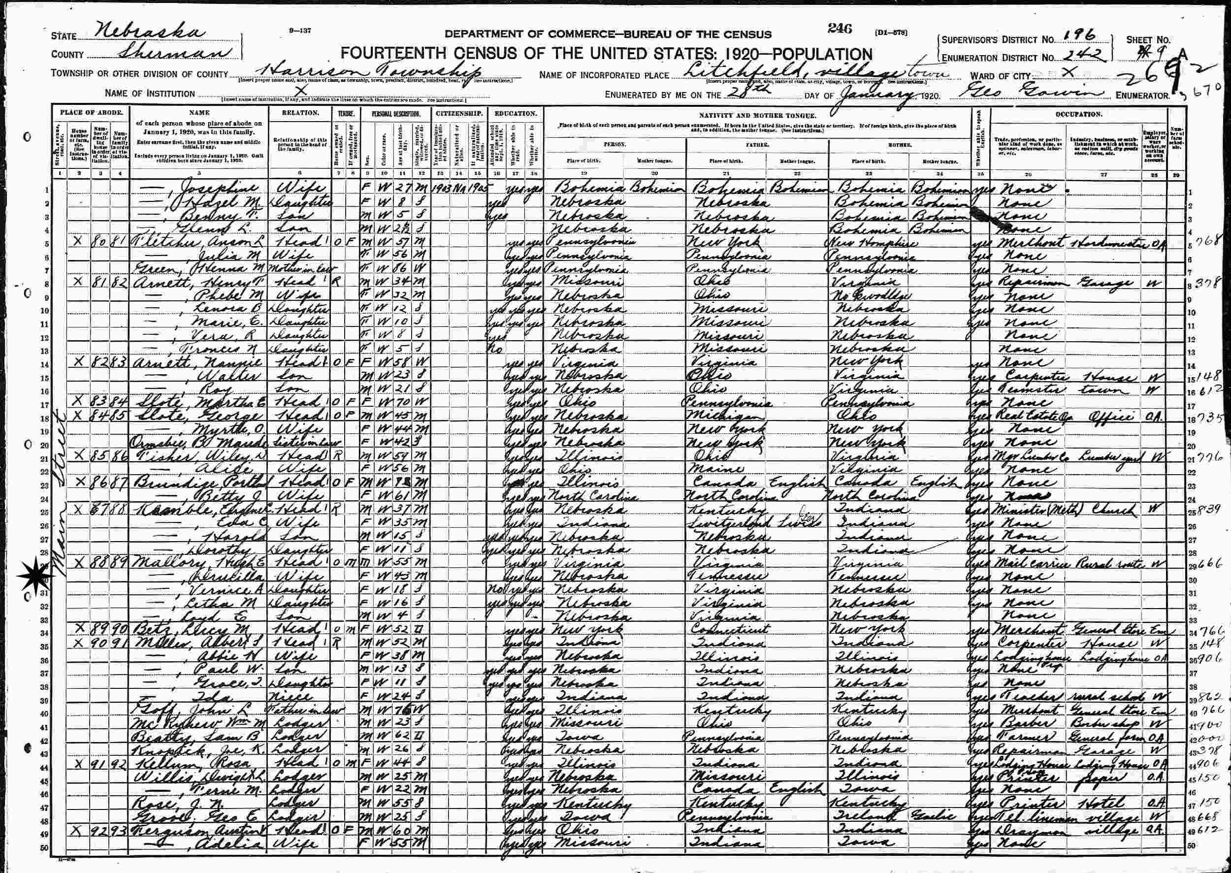 January 28, 1920 - Main Street, Supervisor's District 196, Enumeration District 242, Harrison Township, Litchfield Town, Sherman County, Nebraska.
