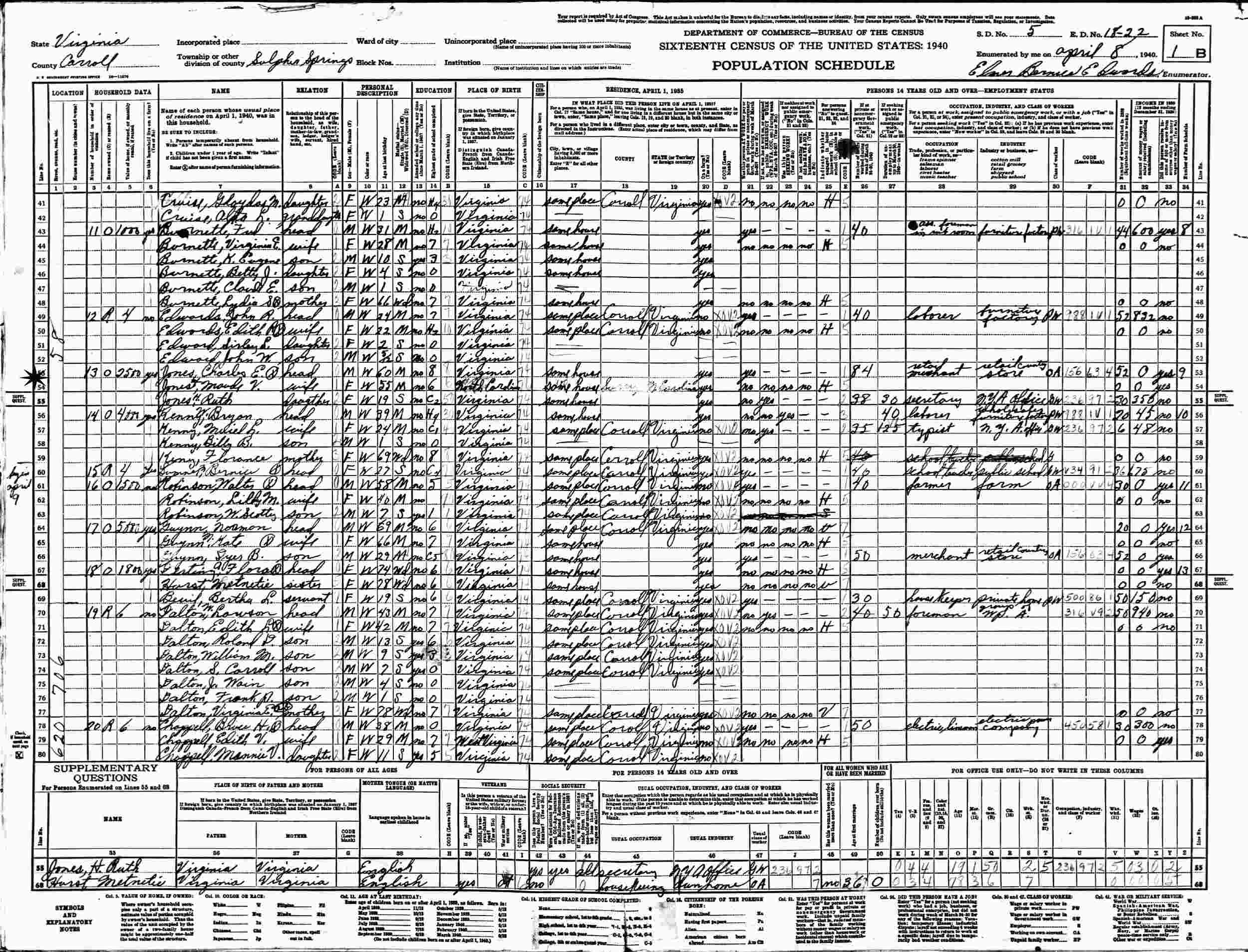 April 8, 1940 - Road 58, Sulphur Springs Magisterial District, Supervisor's District 5, Enumeration District 18-22, Carroll County, Virginia.