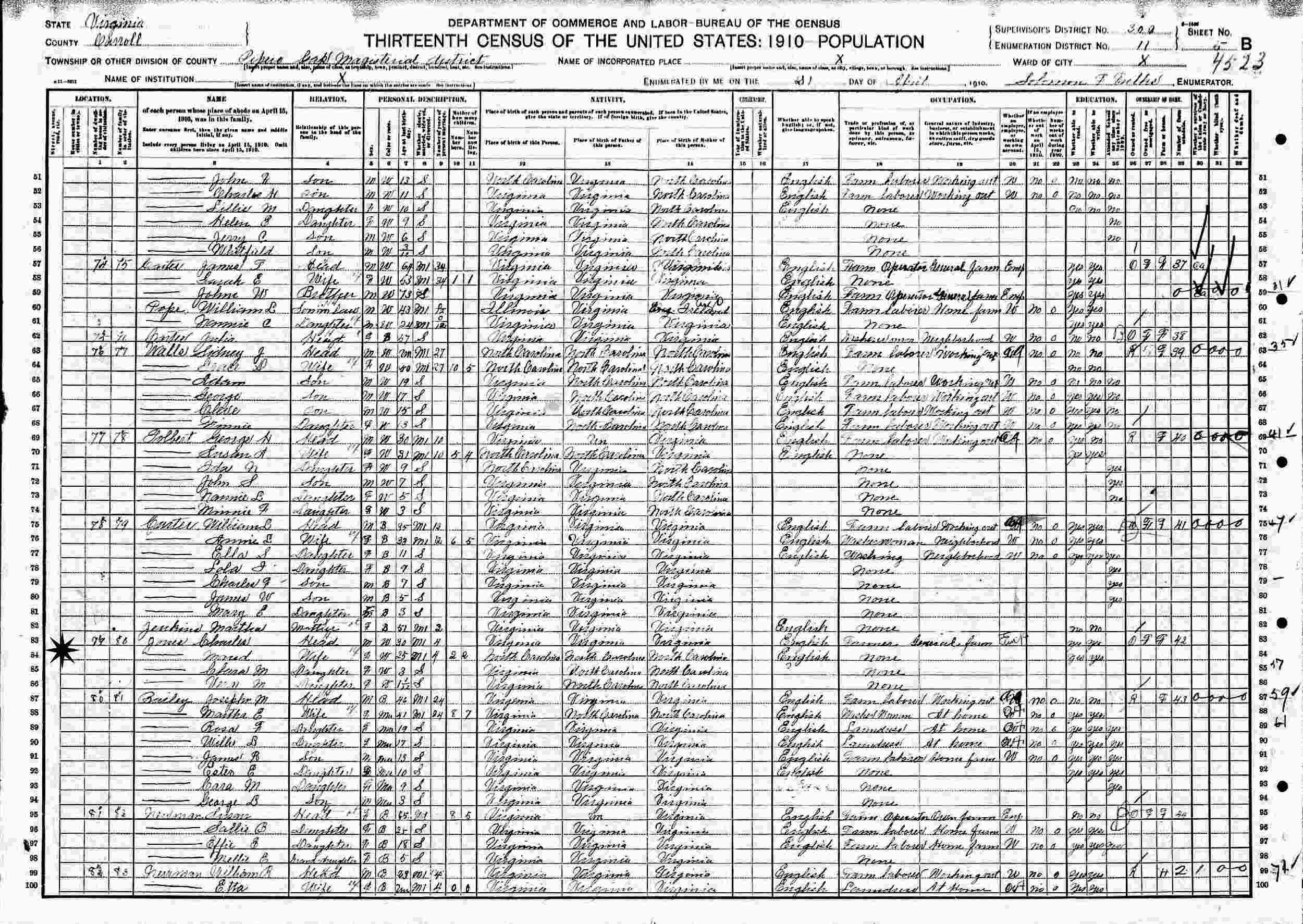 April 21, 1910 - Pipers Gap Magisterial District, Supervisor's District 300, Enumeration District 11, Carroll County, Virginia.