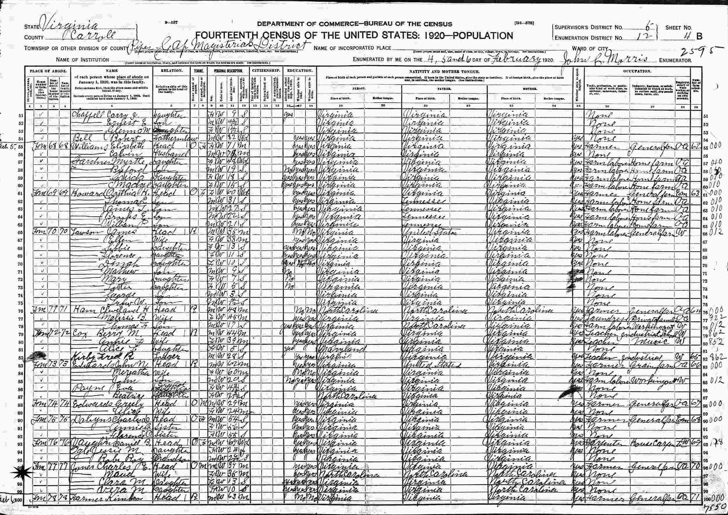 February 5, 1920 - Pipers Gap Magisterial District, Supervisor's District 6 Enumeration District 12, Carroll County, Virginia.