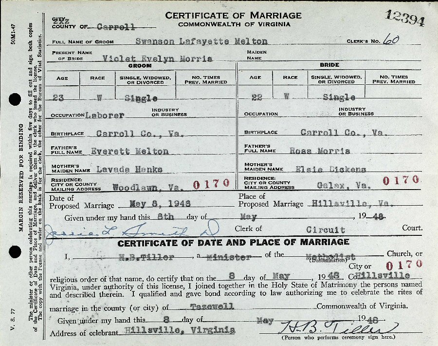 Married: Swanson Lafayette Melton May 8, 1948 in Hillsville, Carroll County, Virginia.