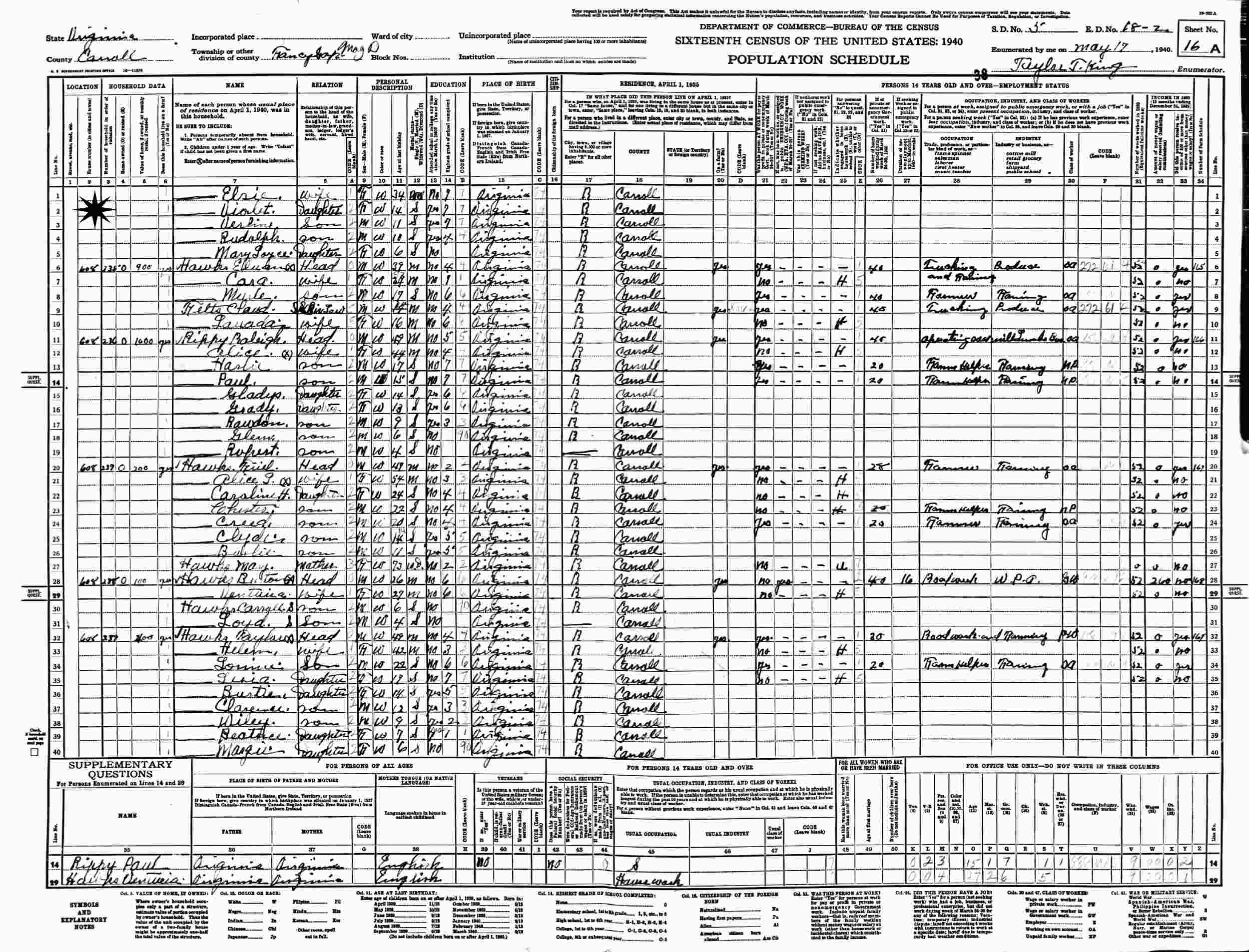 May 19, 1940 - Supervisor's District 5, Enumeration District 18-2, Fancy Gap District, Carroll County, Virginia.