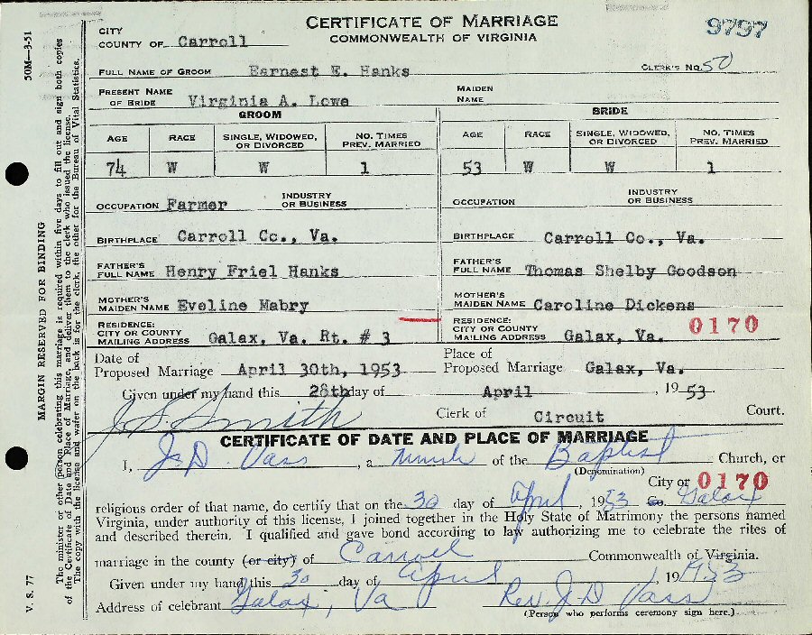 (2) Earnest Edgar Hanks April 30, 1953 in Galax, Virginia.