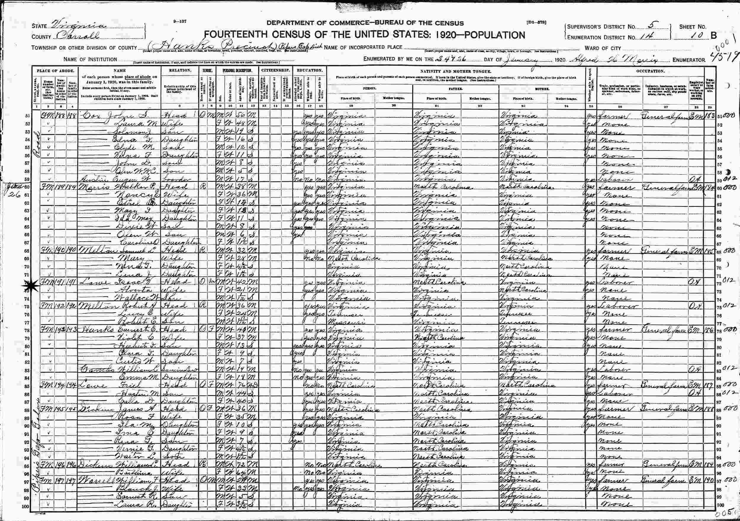 January 24, 1920 - Piper's Gap Galax Road, Supervisor's District 5, Enumeration District 14, Hanks Precinct, Pipers Gap District, Carroll County, Virginia.