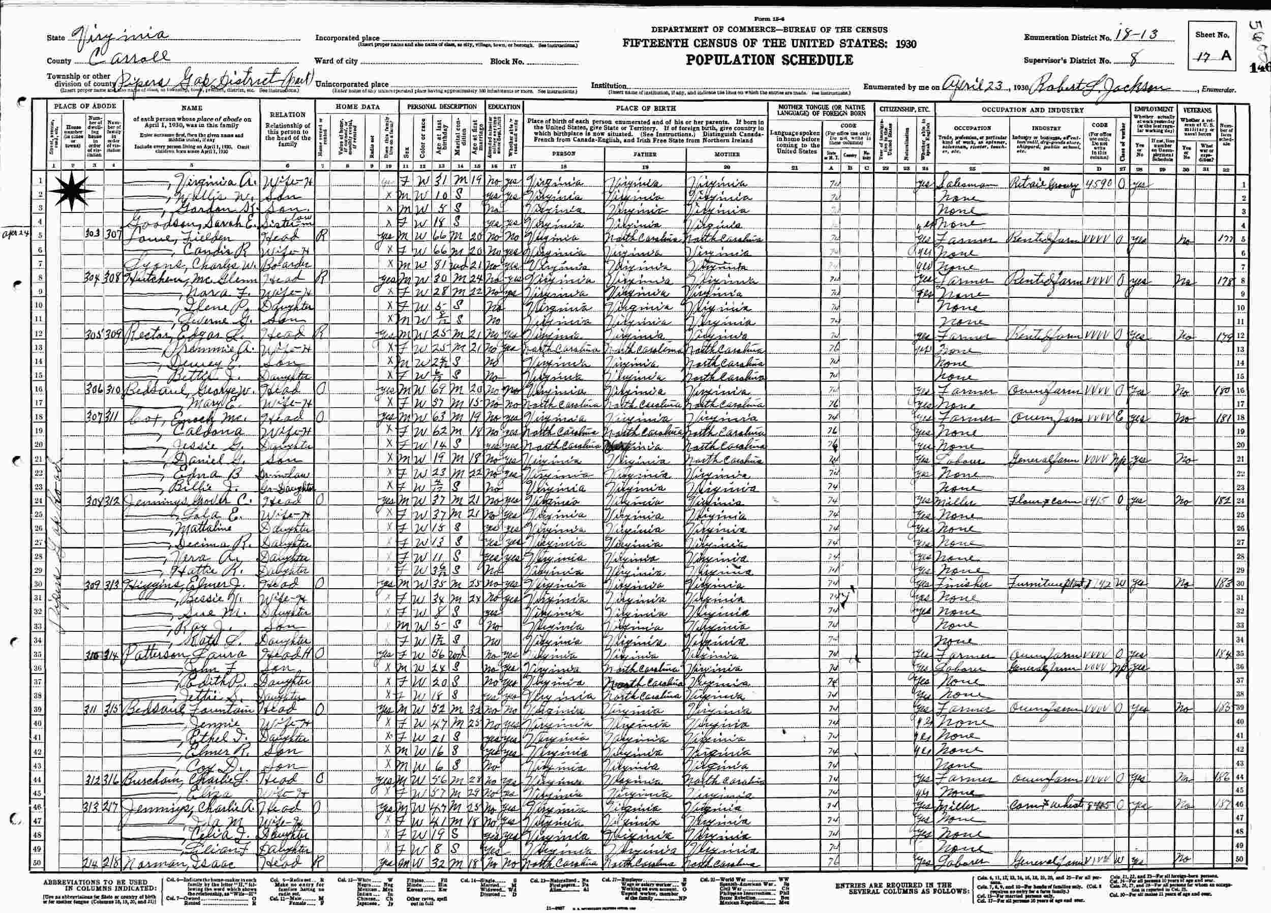 April 23, 1930 - Pipers Gap Road, Supervisor's District 8, Enumeration District 18-13, Pipers Gap District, Carroll County, Virginia.