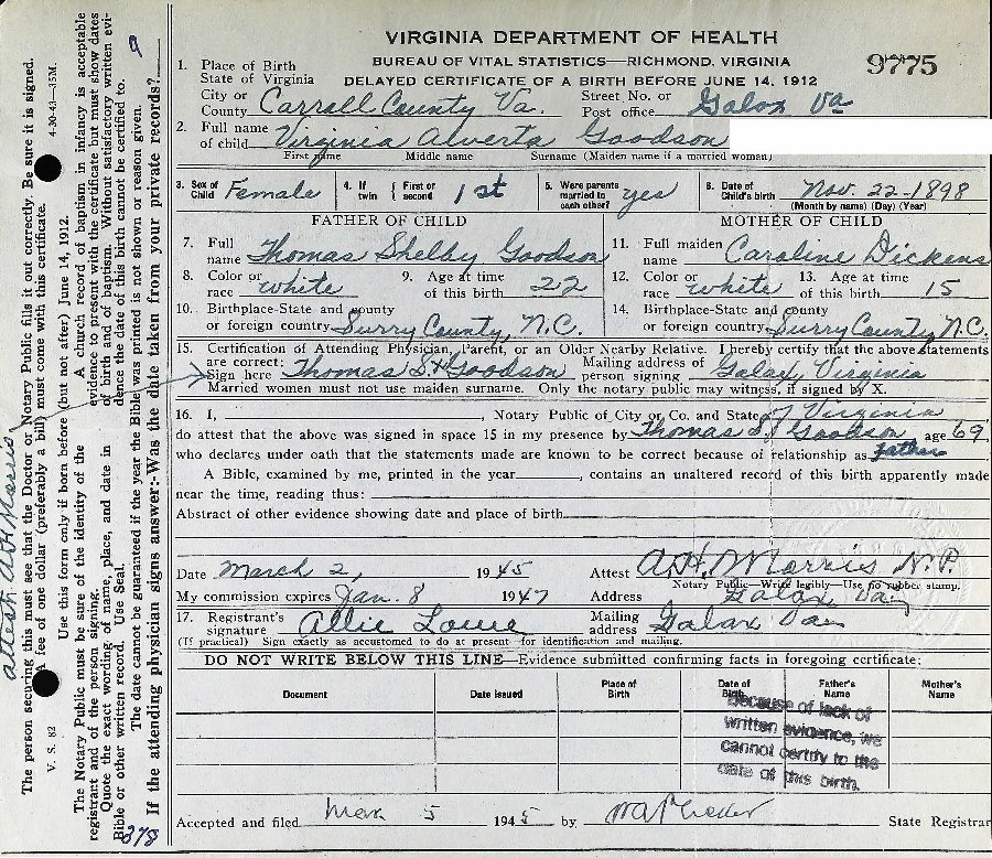 Born: November 22, 1898 in Galax, Carroll County, Virginia.