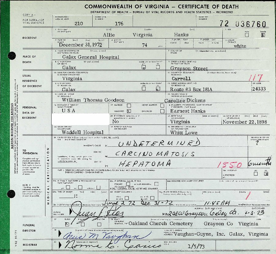 Notes for VIRGINIA ALVERTA "ALLIE" GOODSON LOWE HANKS: