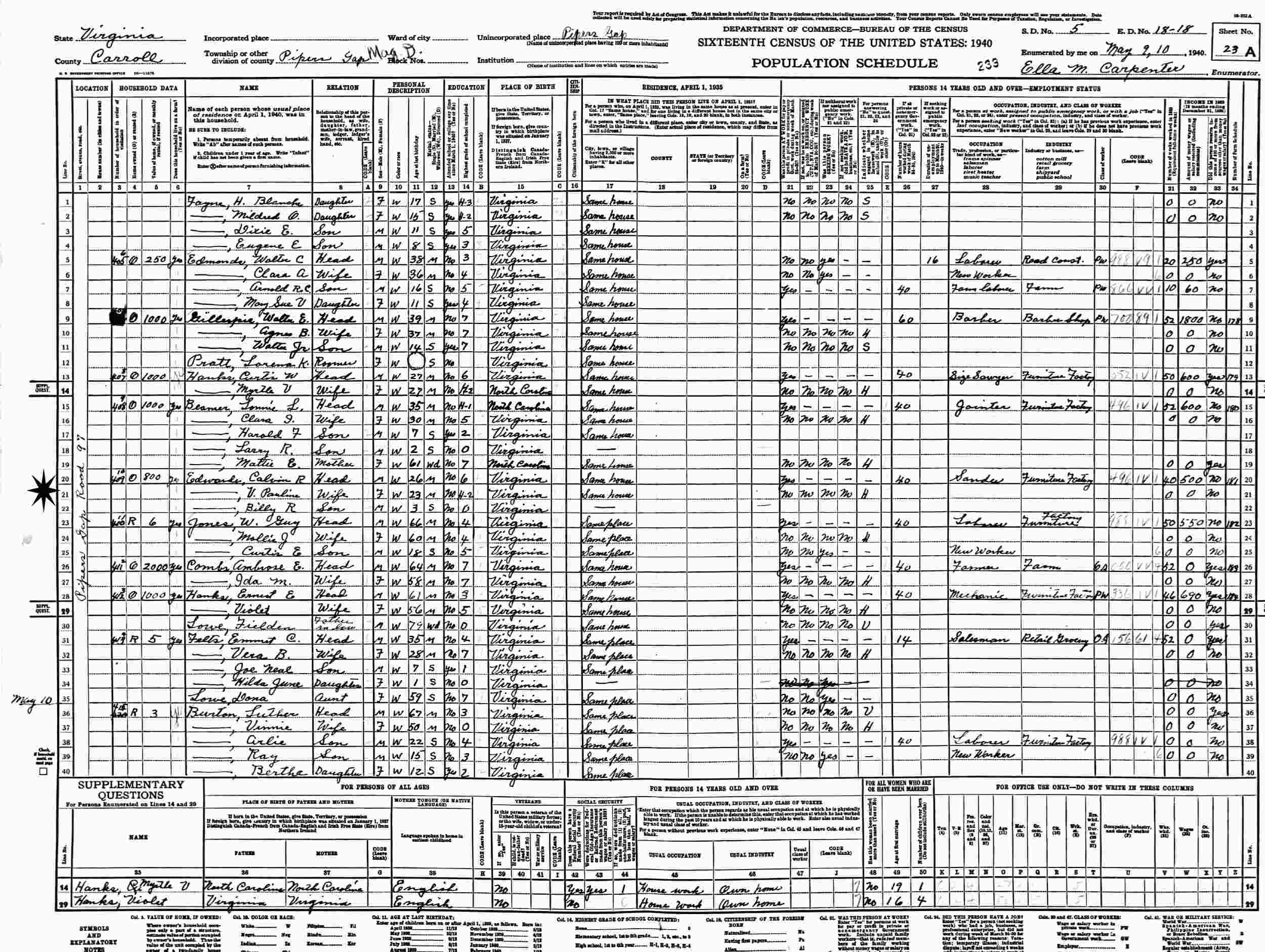 May 9-10, 1940 - Pipers Gap Road 97, Supervisor's District 5, Enumeration District 18-18, Pipers Gap Magisterial District, Carroll County, Virginia.